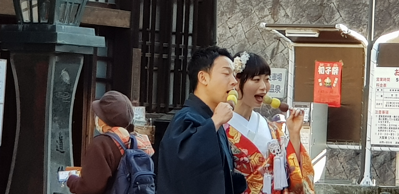 봇장 당고 1개 108엔. 광고 모델이 도고 온천앞에서 봇장 당고를 재미나게 먹는 모습을 연출하고 있다.