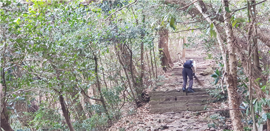 야시마지에서 내려오는 길에 산길 계단에 깔려 있는 낙엽을 빗자루로 쓰는 봉사자를 만났다.