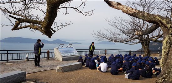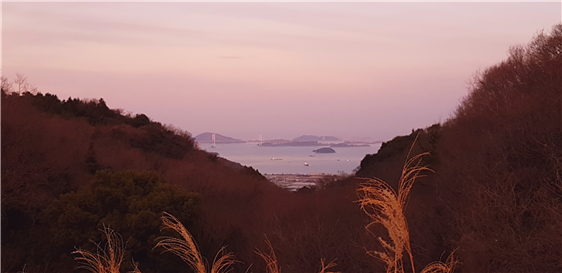 저 멀리 세토대교가 보이고 반대쪽으로 산을 올려다 보면 산너머로 해가 오르기 시작한다.