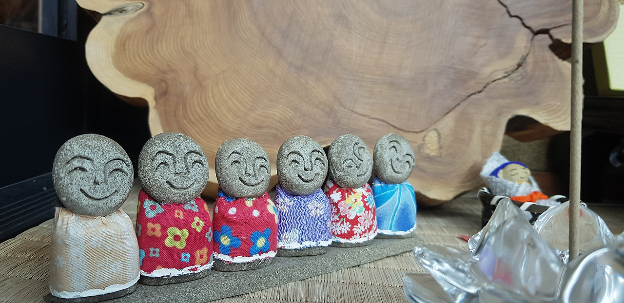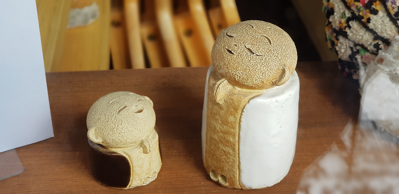 고야마을 미술품 상점에 가지런히 놓여져 있는 미소들.
