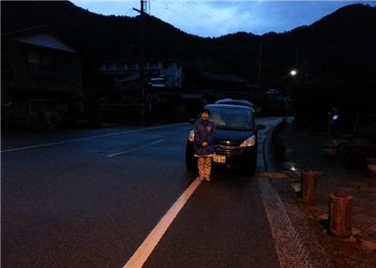 2.5km 내리막길을 30분 내로 내려간다. 할 수 있지. 내려가면서 스이바시를 비롯한 멋진 정경이 펼쳐진다. 아름답게 굴곡진 산하가 내 눈앞에 펼쳐져 있다. 그리고 이어 만나는 에미 상. 목소리가 참 고우시다. 차 안에서, 운전하시면서도 내가 하는 말을 경청하시면서 차분하게 대응하신다. 어쩜, 이렇게 말하기가 편할까?그런데, 에미 상은 감기가 들었는지 목소리가 약간 쉬었고, 기침도 간혹 하신다. 내가 다 미안하다. 전날 숙소에 머문 손님들을 접대하느라고 애쓰셔서 오늘은 쉬시려고 했는데, 괜히 나 때문에 쉬시지도 못한다고 생각하니까 미안한 마음이 절로 인다. 다행히, 저녁 식사는 안 하고 아침만 먹기로 했으니까 그나마 미안한 마음은 조금 가시긴 했다. 그래도 사람을 대한다는 게 얼마나 힘든 일인가? 그냥 사무적으로 대하는 비즈네스 호텔과는 차원이 다르기 때문에 그 힘든 것을 안다.