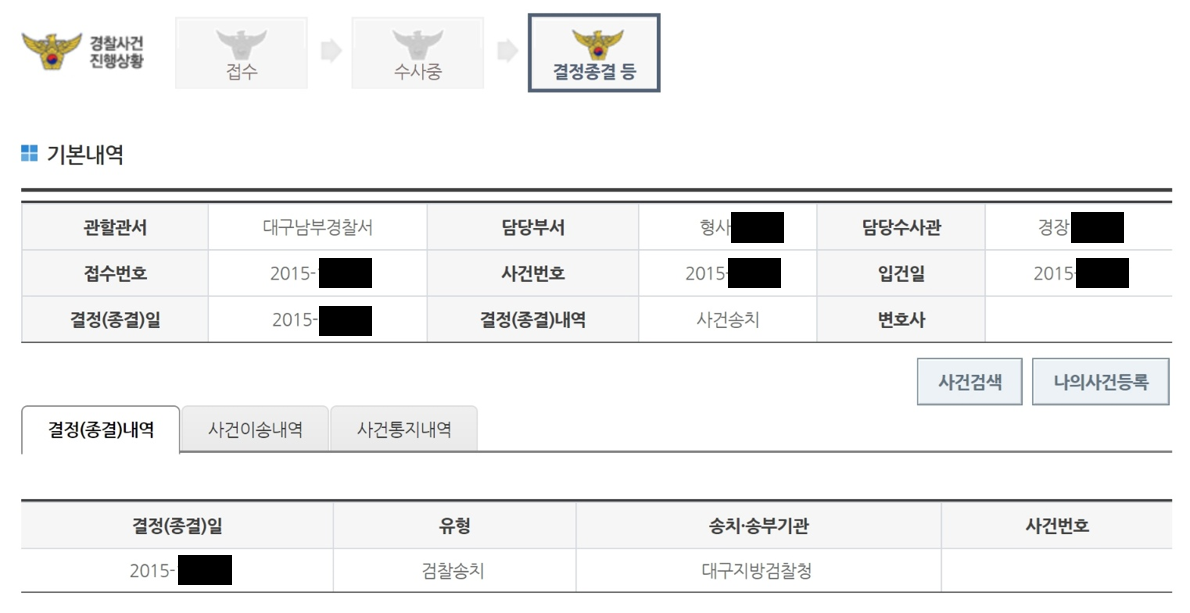 이후 사건의 진행 과정에 대해 경찰서에서는 개인정보 보호를 이유로 자세한 내용을 알려주지 않았습니다. 솔직히 저도 더 이상 그 남성과 마주치고 싶지 않아 더 질문하지 않았습니다. 다만, 사건이 검찰에 송치되었다는 사실은 확인할 수 있었습니다. (그림 2)