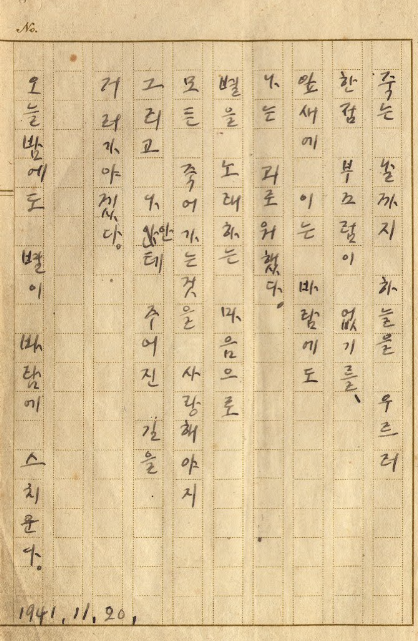 저는 사람뿐만 아니라 모든 생명체에 대한 존중의 마음을 가지고 있습니다. 인간이라는 이유만으로 다른 생명체를 함부로 대할 권리는 없다고 생각합니다. 이런 생각이 들 때마다 윤동주 시인의 「서시」를 떠올리게 됩니다. (사진 1)