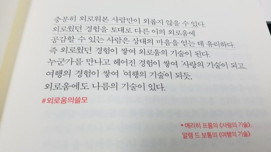 나이가 들어가면서 고요함이 좋고, 복잡함에서 벗어나 자연의 변화에 귀 기울이게 되는 것도 나에게 외로움의 시간이 필요한 신호라는 생각을 해 본다. 그리고 혼자만의 시간은 일상을 더 잘 살아내게 하는 에너지가 될 수 있다는 걸 알았다. 나에게도, 남편에게도, 아이에게도 각자 혼자만의 시간을 선물하고 싶은 건 외로움의 시간도 자연스러운 감정임을, 그 외로움의 시간도 견뎌낼 줄 알아야 우리가 같이 잘 살아갈 수 있으리라. 작가의 외로움에 대한 단상은 새롭기도 하고, 익숙하기도 하다. 외로움을 느껴도 괜찮다고, 다 괜찮다고 말해주는 것 같다. 어쩌면 나에게 외로움의 시간은 산소호흡기 같은 것인지도 모른다는 생각이 들었다. 살다가 문득 문득 만나게 될 외로움에 낯가리지 않는 나이기를, 혼자의 시간도 가만히 잘 즐길 수 있는 나이기를, 마음의 근육을 키울 수 있는 기술을 가진 나이기를, 나는 그렇게 어른이 되어간다.