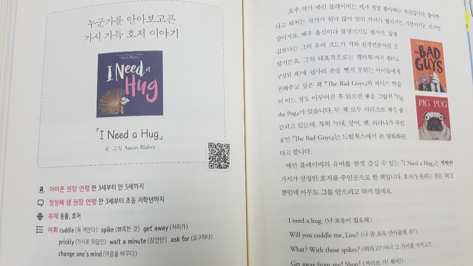 고민이 시작되는 그 시점에 타이밍 좋게 책 <정정혜 샘과 함께하는 첫 영어 그림책>을 만났다. 인터넷을 검색해보니 엄마표 영어, 영어 그림책과 관련된 자료도, 책도 많았지만 그동안 관심이 없었던 나는 이제서야 알게 된 것이다. 책 <정정혜 샘과 함께하는 첫 영어 그림책>은 우선 구성이 좋았다. 아이들 학습 단계에 맞는 영어 그림책을 소개하고 있으며, 권장 연령과 주제, 어휘도 정리되어 있어 엄마표 영어를 준비하기에 활용도가 높다. 휴대폰으로 QR코드를연결하면 선생님이 그림책을 직접 읽어주는데 엄마인 내가 봐도 꽤나 흥미롭다. QR코드로 선생님의 책 읽기를 보고, 그림책에 대한 설명을 읽으면 아이에게 어떤 느낌으로 읽어주면 좋을 지 감을 잡을 수 있다. 거기에 모든 그림책과 관련된 독후활동 Tip까지 더해져 있어 즉시 활용하기에도 꽤나 유용해보인다.