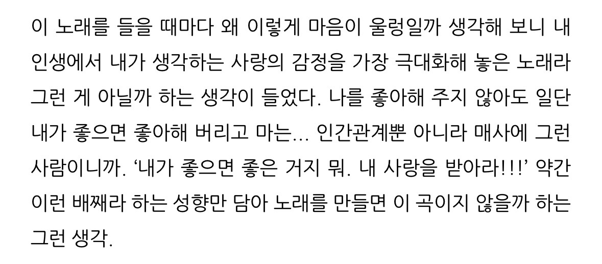 아직 스물다섯밖에 안 됐으니 앞으로 인생의 주제곡이 몇 번 더 바뀔지도 모른다. 또한 예전보다 집착을 덜 하게 되었을 뿐, 사람들의 애정과 응원을 필요로 하는 사람이라는 점은 여전하다. 그래도 ‘구애’를 들을 때마다 공감의 눈물을 흘리던 과거의 한 시절은 분명 지나갔음을 기념하며. 직접 작성한 가사 해석본 발췌를 끝으로 글을 맺는다.