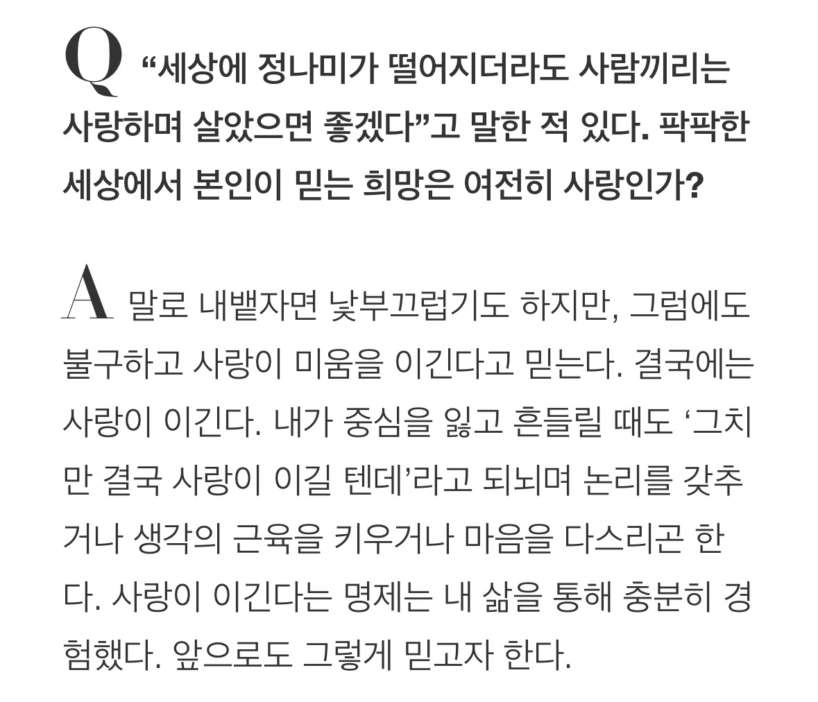 아이유는 결국 사랑이 이긴다는 명제를 자신의 삶으로써 충분히 증명했다는데, 나는 아직 그렇지 못한 것 같다. 나에게 이 명제는 어떠한 주문이나 종교 같달까. 그냥 믿는 거다. 눈에 비친 세상은 그렇지 않은 것 같지만 언젠가는 사랑이 이기겠거니, 그래도 혐오의 편에 서는 것보다는 사랑의 편에 서는 것이 낫겠거니, 하며 속는 셈 치고 믿어 보는 거다. 언젠가 이 명제를 의심 없이 받아들일 수 있는 날이 오기를 바란다. 그래서 같은 고민에 빠진 사람들에게 ‘내가 살아 보니 결국 사랑이 이기더라. 그러니 겉으로는 혐오와 증오가 훨씬 힘 있는 것 같아 보여도 다정함을 잃지 마.’ 하는 위로를 자신 있게 건넬 수 있도록.