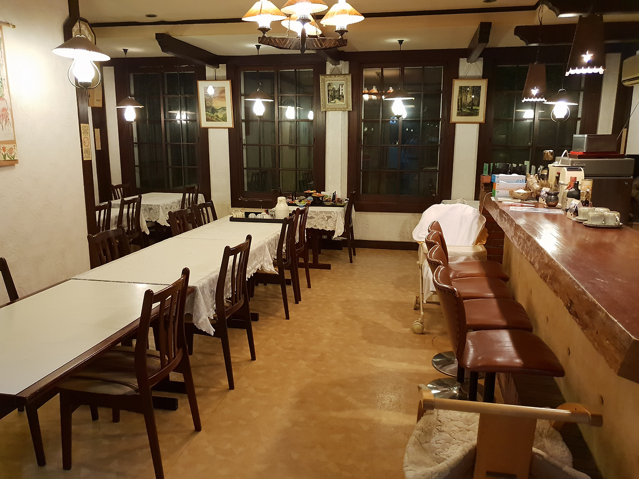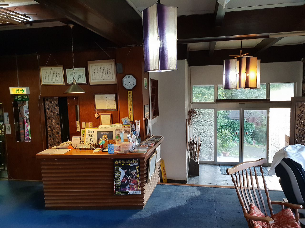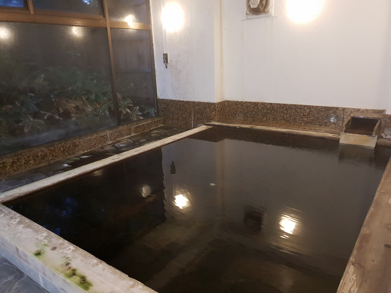 짝꿍은 창가에서 가져온 책을 읽고 나는 이불 위에서 잠들듯 말 듯 졸다 보니 흐르는 시간이 조금 아까웠다. 그래서 식전에 온천욕을 하려 어색한 유카타로 갈아입고 지하 같은 1층의 탕으로 향했다. 투숙객이 우리밖에 없으니 들어가기 전에 탕의 사진도 남겼다. 료칸의 객실과 마찬가지로 사용감이 있고 새것은 어디에도 없지만 정갈하고 깨끗하다. 족히 열 명은 들어갈 듯한 탕을 마음껏 쓴다니 운이 좋았다.