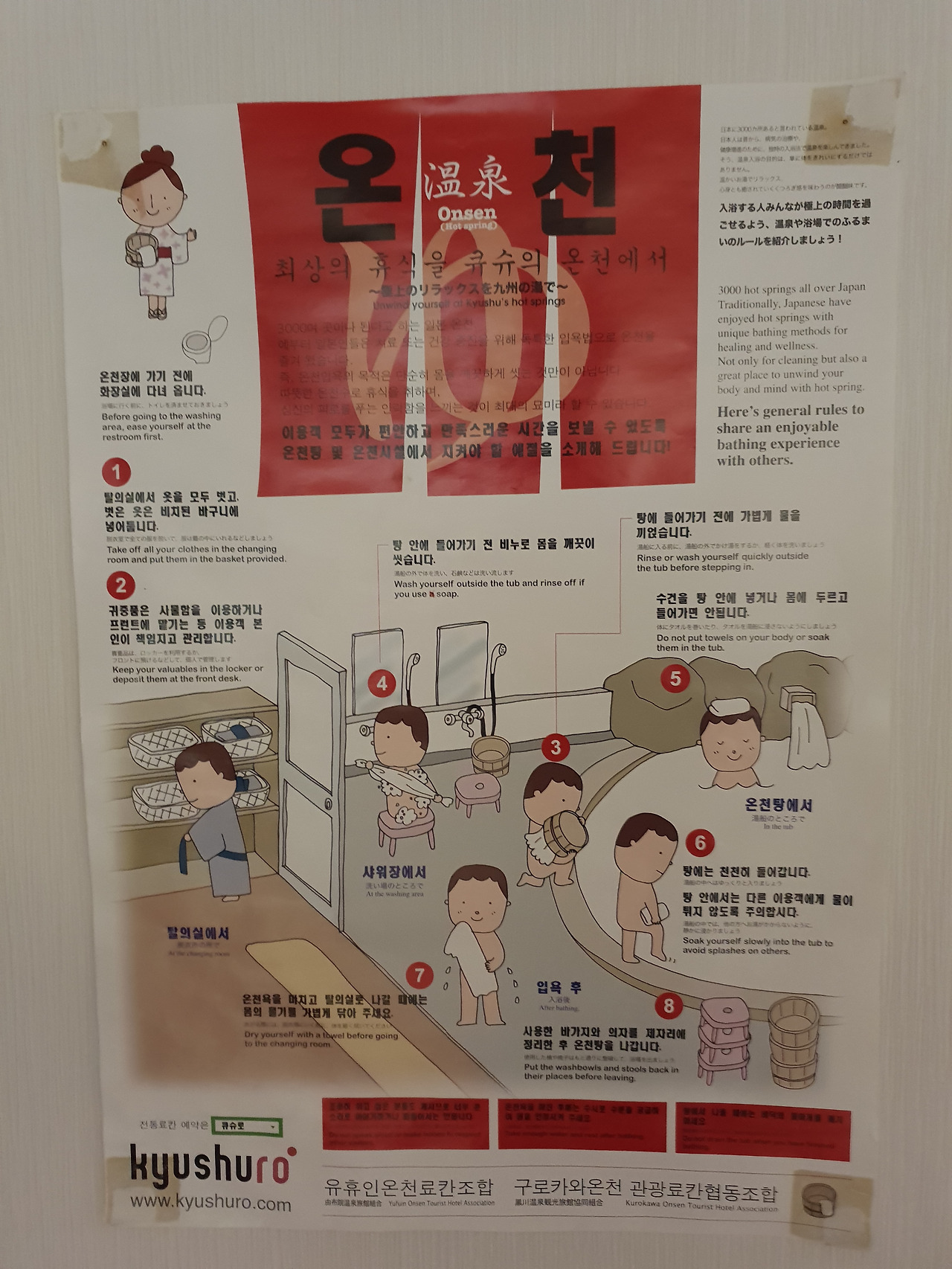 운이 좋은 온천 초보의 온천욕이란 이런 것이다. 벽에 붙어있던 입욕 예절을 꼼꼼하게 숙지하고 탕에 입장한다. 머리부터 발끝까지 깨끗하고 꼼꼼하게 샤워를 한다. 온천수에 몸을 담근다. 왠지 몸에 닿는 물의 느낌마저도 좋은 것 같다고 홀로 호들갑을 떤다. 뒤에 기대듯 몸을 늘어뜨리며 '아... 천국이다' 생각이 들 즈음, 그러니까 샤워한 시간과 비슷한 시간을 탕 안에서 보내고 나면 너무 더워 견디지 못하고 일어선다. 원래 몸에 열과 땀이 많은 사람이긴 하나 온천 초보인 나의 온천욕은 아직 이 정도 시간이 한계다. 온천욕이나 동네 사우나를 즐기는 사람들이 보기에는 부모님 손 잡고 목욕탕 처음 가본 미취학 아동 정도의 입욕시간 되겠다.