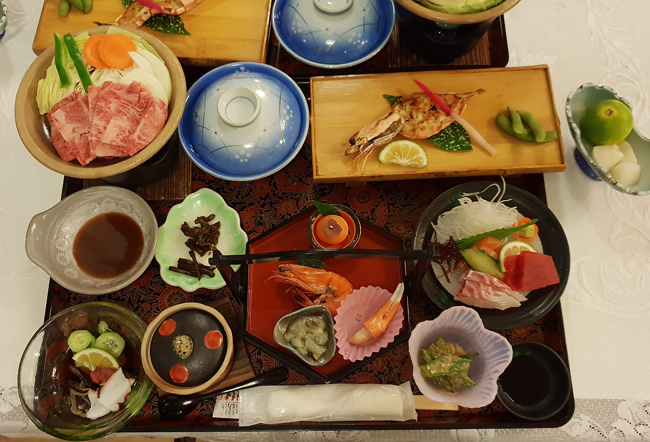 료칸을 잡을 때 방만 예약하고 일본식 정찬인 가이세키는 예약하지 않았다. 안 그래도 료칸 자체가 비싸다는 선입견이 강했는데 그 생각엔 가이세키가 한몫했기 때문이다. 더불어 많은 주변 여행자들로부터 질이 좋은 건 알겠지만 너무 전통식이라 요즘 우리 입에는 안 맞는단 얘기를 들어왔다. 그런데 내가 막연하게 생각했던 것보다는 저렴했던 이 료칸은 가이세키도 생각보단 저렴해 짝꿍과 의논 끝에 가이세키에 도전하기로 했다. 약속한 시간에 내려가니 오래된 호텔의 분위기 좋은 레스토랑 같은 식당이 우리를 반겼다. 한 쟁반씩 받아 들었는데 보기만 해도 도전하길 잘했다는 답은 나왔고 한 절음씩 들다 보니 이내 이 가이세키로 료칸 여행이 완성된다는 확신이 들었다.