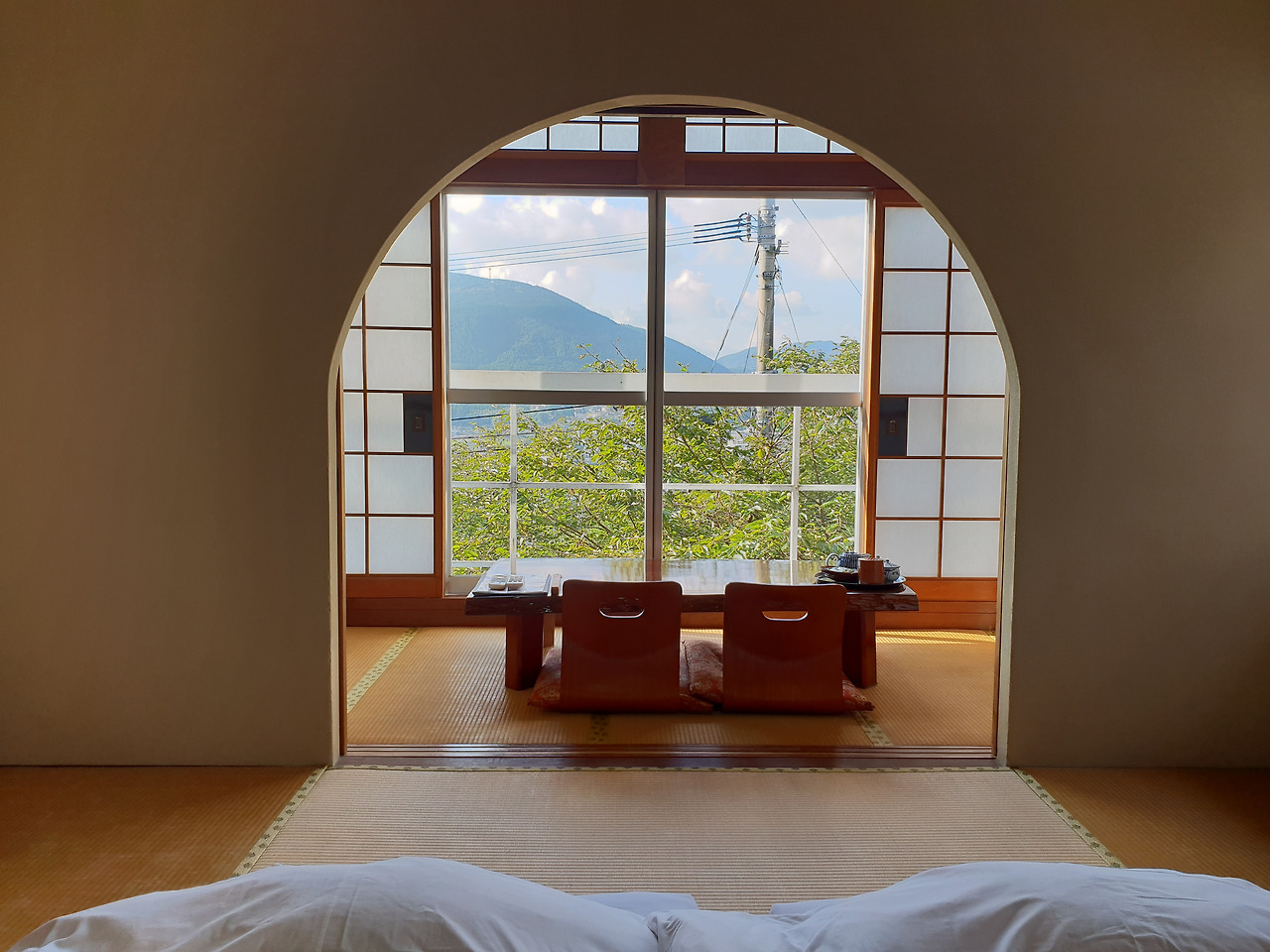 짐을 풀고 잠시 쉬며 공간을 즐겼다. 밖에서 볼 때는 양옥의 모양이었지만 방 안은 영락없이 일본식 공간이다. 방안 작은 욕실에는 쪼그리고 들어갈 수 있는 히노끼탕이 있었다. 텔레비전 이라기에는 많이 작고 요즘은 모니터로 쓰기에도 작아 보이는 게 한편에 있고 오래됐지만 잘 작동하는 에어컨도 있었다. 옷도 갈아입지 않고 이불 위에 누우니 폭신하고 깨끗한 침구가 편안하게 감싸준다. 료칸에 들어선 이상 정해진 일정이라곤 온천욕과 식사밖에 없으니 몸과 마음에 여유가 흘렀다.
