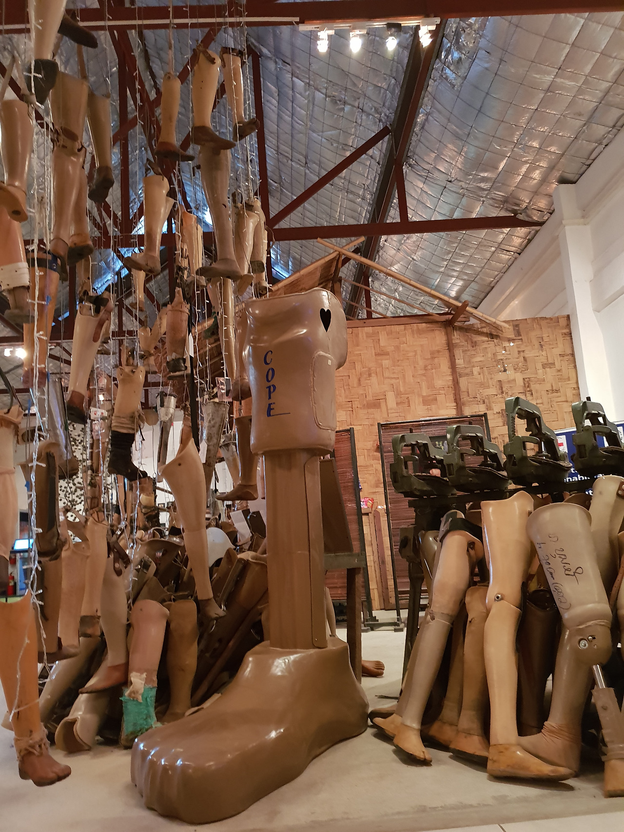 3일 차가 되자 직원들은 우리를 이상하게 생각하기 시작했다. 체크아웃 시간이 지날 때까지 누워서 뒹굴대다 청소부가 들어오면 자리를 내어주고 중정에서 늘어졌다 기어 들어갔다를 여전히 반복했기 때문이다. 그들이 볼 때 우리의 하루 일과는 이랬으리라. 조식 시간 끝물에 기어 나와 소량을 섭취하곤 침대로 사라지고, 다시 나왔다 들어갔다 하루 종일 하는데 하는 거라곤 흡연과 음주밖에 없어 보였을 것이다. 실로 그러했다. 근처에 잠깐 산책을 나서 골목을 구경하기도 했고 환전도 하고 커피도 한 잔 마시고 했지만 일반적인 여행자의 활발함은 찾아볼 수 없었겠지. 호주인 친구 톰이 꼭 가보라고 한 재활병원에 방문한 게 6일 일정 중 가장 큰 일이었다. 베트남 전쟁 이후로 라오에는 아직까지 수많은 불발탄이 있다. 클러스터 폭탄Cluster bomb이 대부분인데 전쟁 때 다친 사람 말고도 지금까지도 수많은 사람들이 다치고 있는 현재 진행형인 재앙이다. 얼마나 불발탄이 많으면 식당이나 슈퍼마켓 같은 데서 입구에 장식처럼 쓰거나 집 기둥으로 사용하기도 할 정도다. 라오스 수도 비엔티안엔 폭탄으로 사지를 잃은 사람들의 재활을 돕는 병원과 작은 박물관이 있어 추천을 받고 방문했고 후회 없는 선택이었다. 작은 전시 공간을 보며 멀리서나마 느껴지는 게 많았다.*