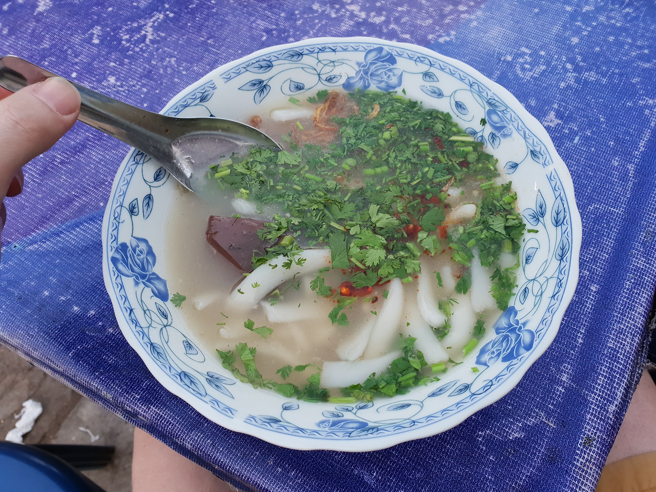 마주치는 직원들은 환하게 웃으며 말을 걸어왔는데 어디 가냐는 물음에 쉴 거라고 얘기하니 다들 납득하는 분위기였다. 늦은 밤 도착했으니 피곤한 것도 알 테고 한눈에 컨디션이 좋지 않은 일행도 보이는데 새벽까지 달린 게 이미 소문이 다 난 듯했다. 그렇게 종일 쉬다가 숙소 앞 골목에서 라오스식 쌀국수인 카오삐약과 꼬치구이를 사다 비어라오에 곁들여 저녁을 먹었다. 라오스와 동남아에서 수백 그릇의 쌀국수를 먹어봤지만 이 허름한 노점의 카오삐약은 단연 최고였다. 한 그릇 1,000원 정도의 가격인데 뼈 붙은 고기에 선지까지 내용물도 좋고 국수도 맛있었다. 현지식에 도전하는 서양인들도 있지만 많은 경우 위생 때문인지 꺼리기도 하는데 옆 테이블의 서양인들이 우리를 신기한 듯 쳐다봤다. 어떤 음식이냐 물으면 맛보러 건네주기도 하고 말도 몇 마디씩 섞으며 게스트하우스 특유의 매력을 즐겼다.