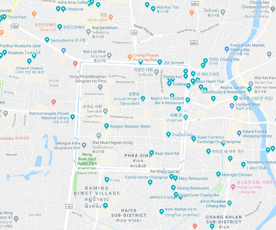치앙마이 지도. 정 사각형의 올드시티가 인상적이다 / 출처 : 구글 지도 캡처