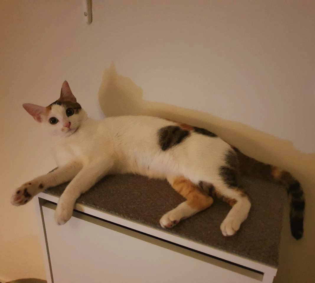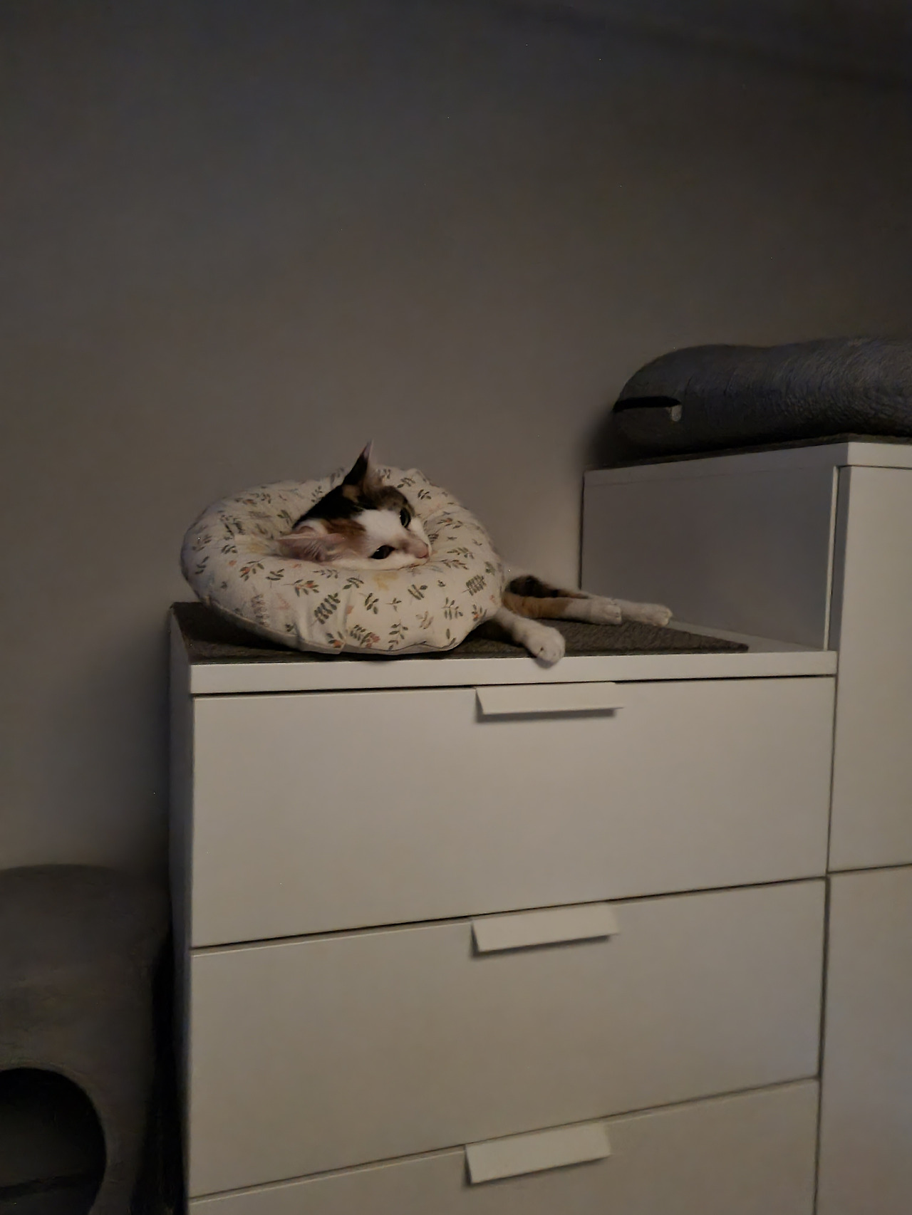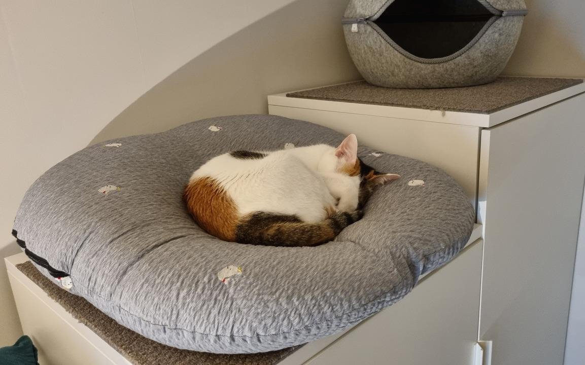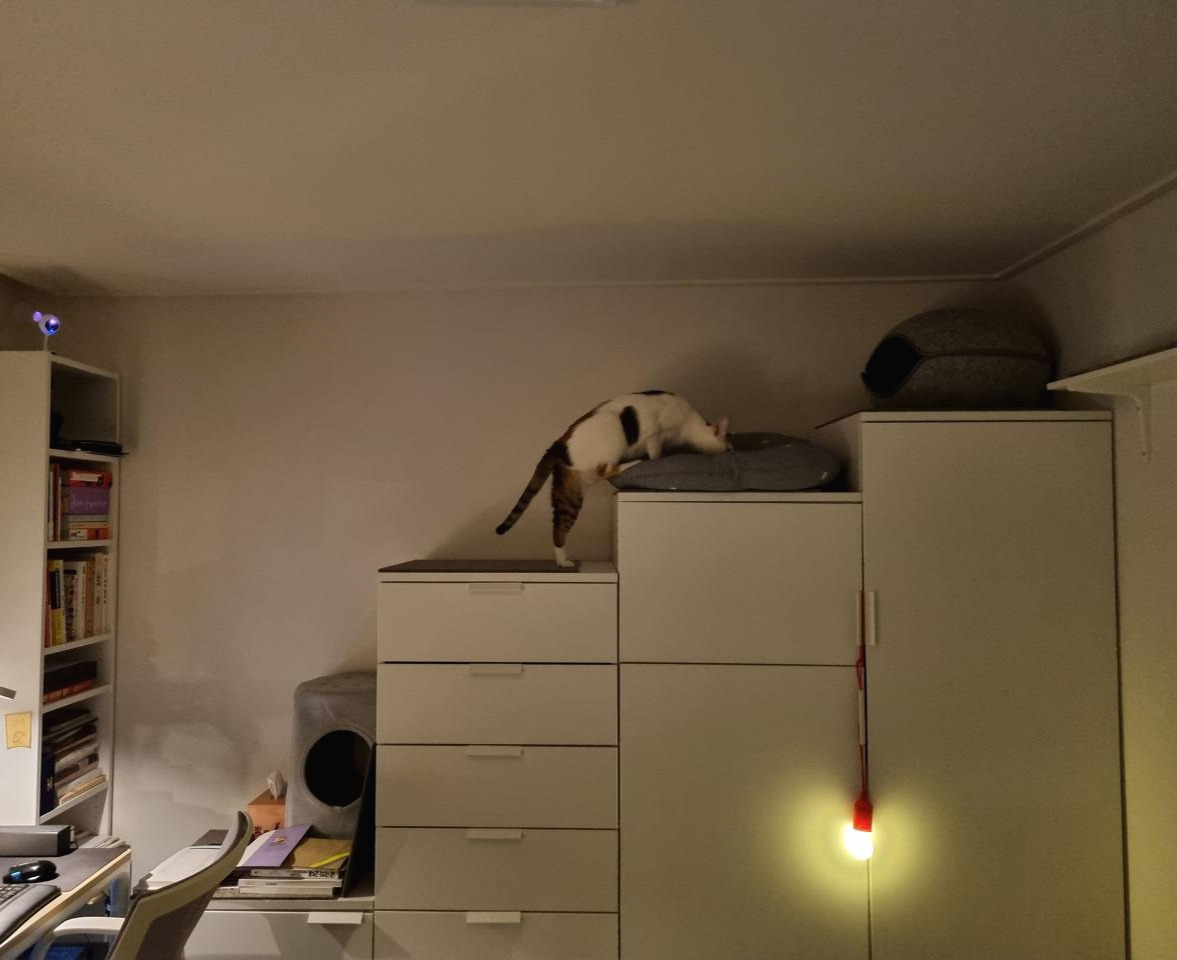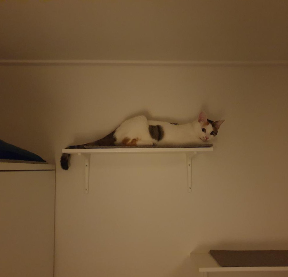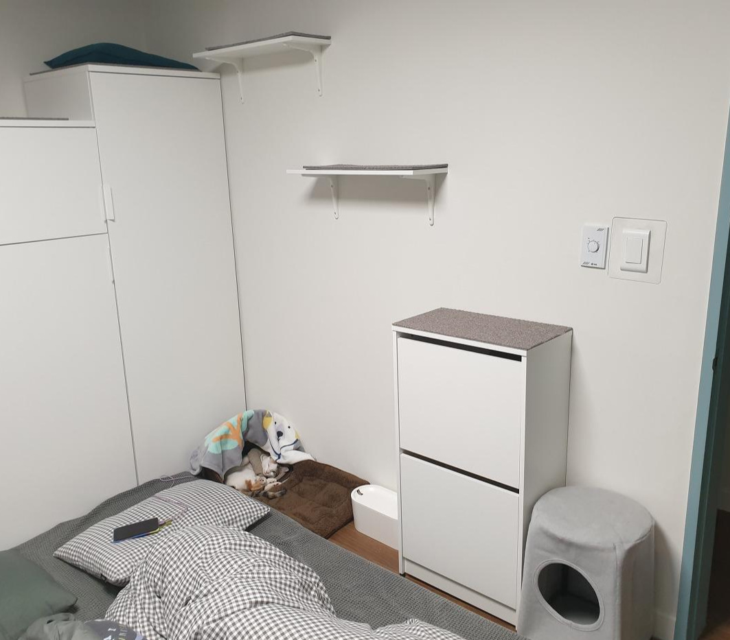 우리는 벽선반과 수납가구, 의자를 활용한 숨숨집으로 안방 한쪽 벽에 캣워크를 구성했다. 방문으로 들어오면 바로 숨숨집-수납장-벽선반 순서로 올라갈 수 있고 옷장 위로 이어진다. 모든 선반과 가구 위엔 타일 카펫을 크기에 맞게 잘라 올렸다. 미끄럼 방지 효과와 함께 패브릭에 쏘이의 냄새가 묻어 자신의 영역이라는 안정감도 준다. 스크래처로 사용될 수 있는 것도 큰 장점이다. 고양이 영역의 구석구석에 패브릭과 스크래처가 많아야 좋다. 공구 사용에 미숙하고 힘도 약한 내가 직접 해머 드릴로 설치했는데 고작 구멍 8개 뚫다 너무 힘들어서 진짜로 울 뻔했다. 그래도 설치하자마자 원래 알고 있던 길인 것처럼 잘 써줘서 기뻤다.