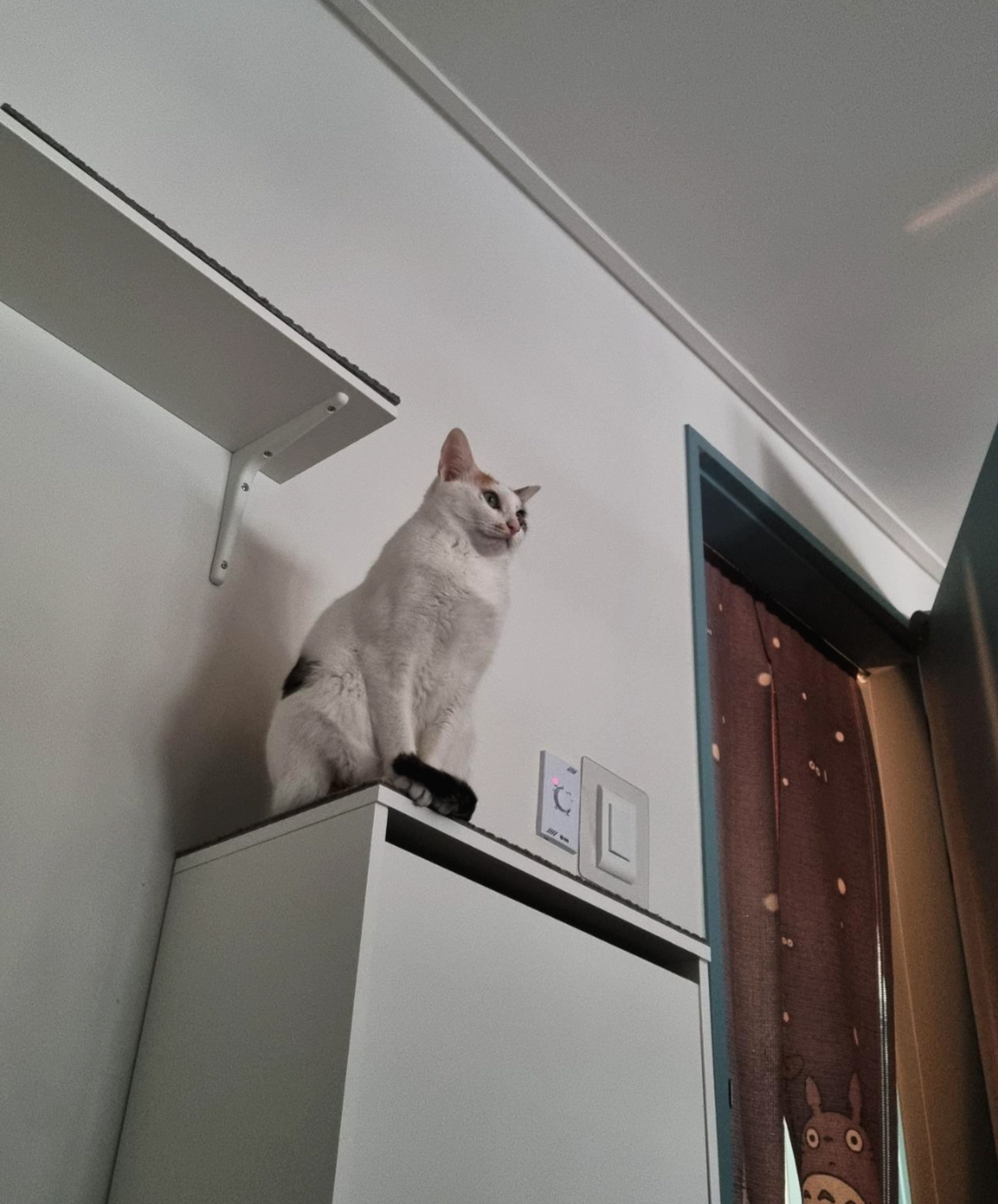 공간 구성 시점에서 고려해볼 수 있는 건 캣워크(캣워커, 캣선반, 고양이선반 등으로도 불린다)다. 캣워크는 벽이나 천장에 고양이가 다닐 수 있는 길을 만드는 것이다. 집사에겐 큰 효용이 없는 벽, 천장을 고양이 전용 통로로 활용할 수 있다. 침대나 소파, TV가 놓이면서 죽는 벽면도 살릴 수 있는 방법이다. 안전하게 고정해야 하기 때문에 가급적 콘크리트 벽에 시공하는 게 좋다. 다른 재질의 벽이나 천장에 설치할 경우 보강재나 전문가의 도움이 필요할 수 있다. 계단, 통로, 터널 등 다양한 구성이 가능하며 앞서 말한 캣타워, 캣폴 혹은 일반적인 가구, 가전과 결합해 무궁무진한 동선을 만들 수 있다. 우리는 인테리어 단계에서 거실과 안방에 여러 설치 방안을 고민했으나 예산과 시간문제로 용이치 않았다. 직접 설치하기로 하고 이사 후 안방 벽면에 이케아 벽선반*을 활용해 설치했는데 쏘이가 가장 좋아하는 길이 되었다.