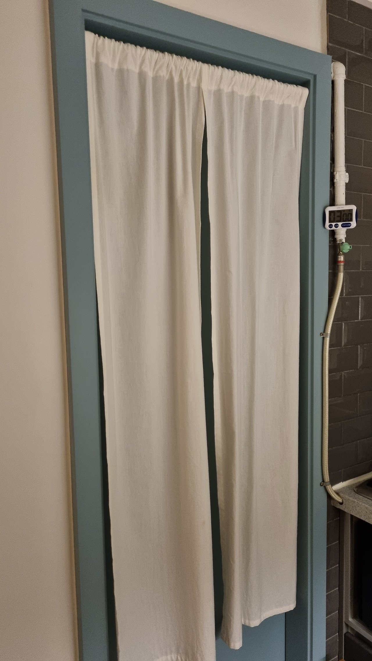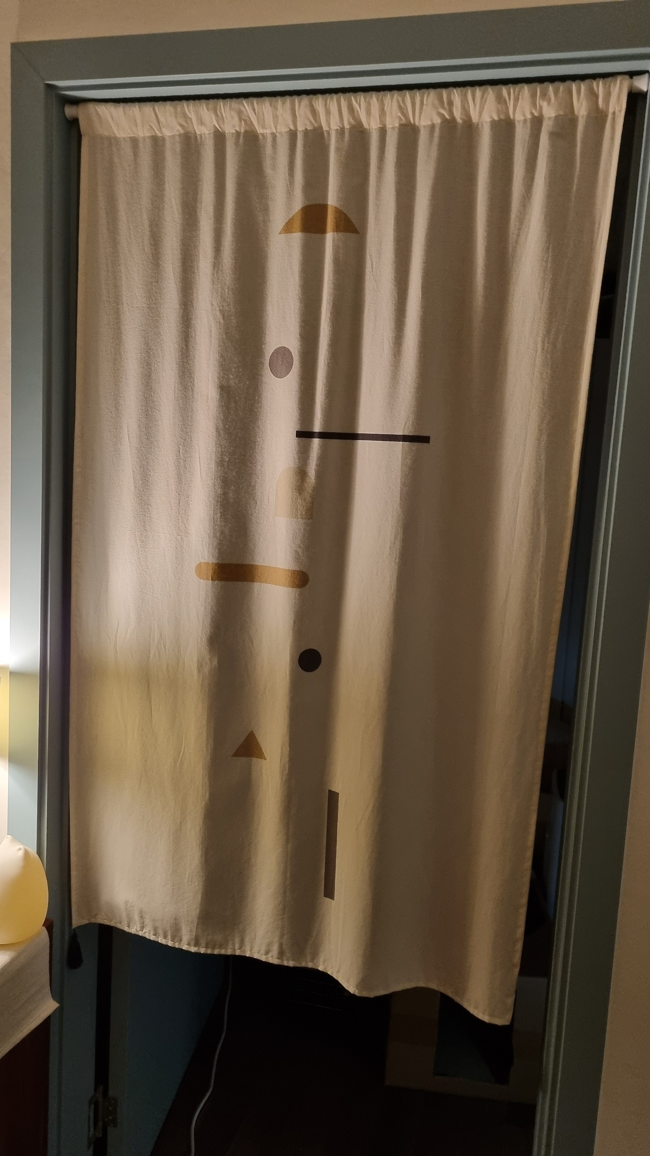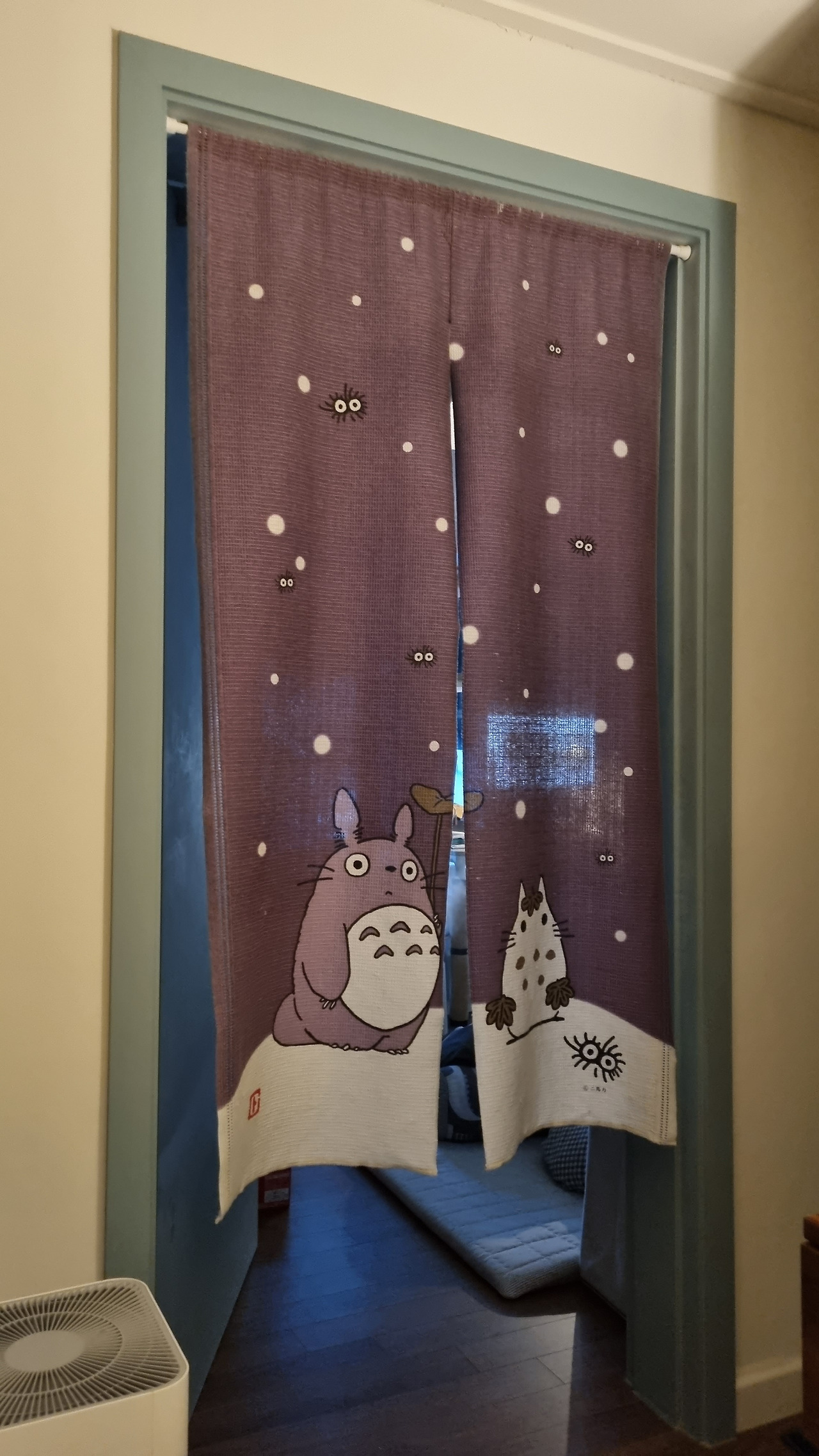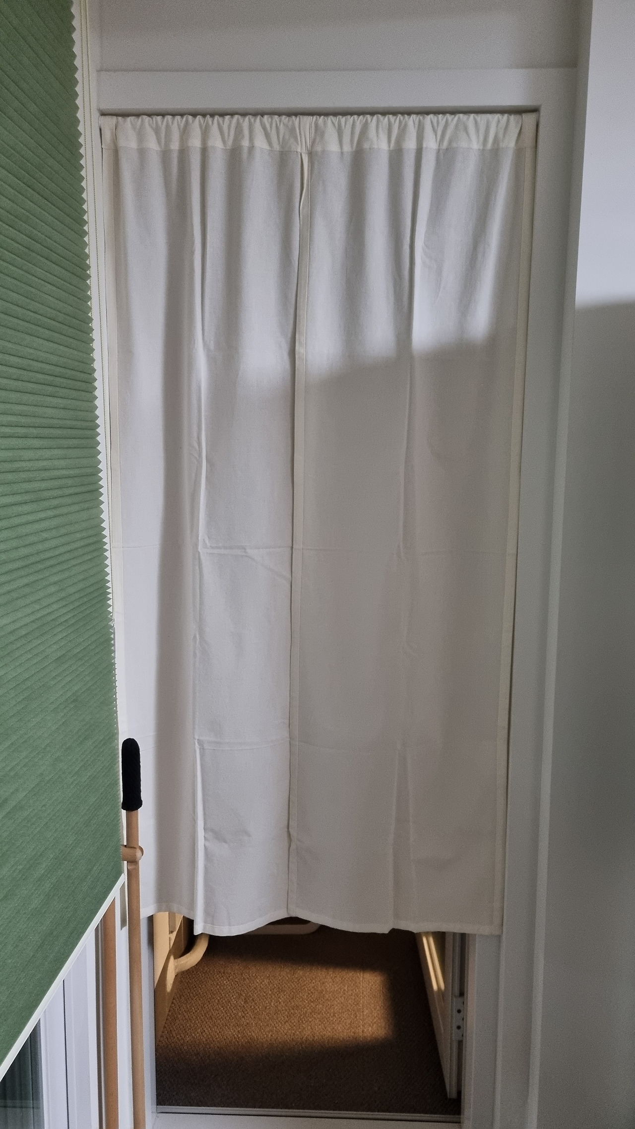 발코니 문에 설치한 긴 노렌과 열린 문에 설치한 도어 스토퍼