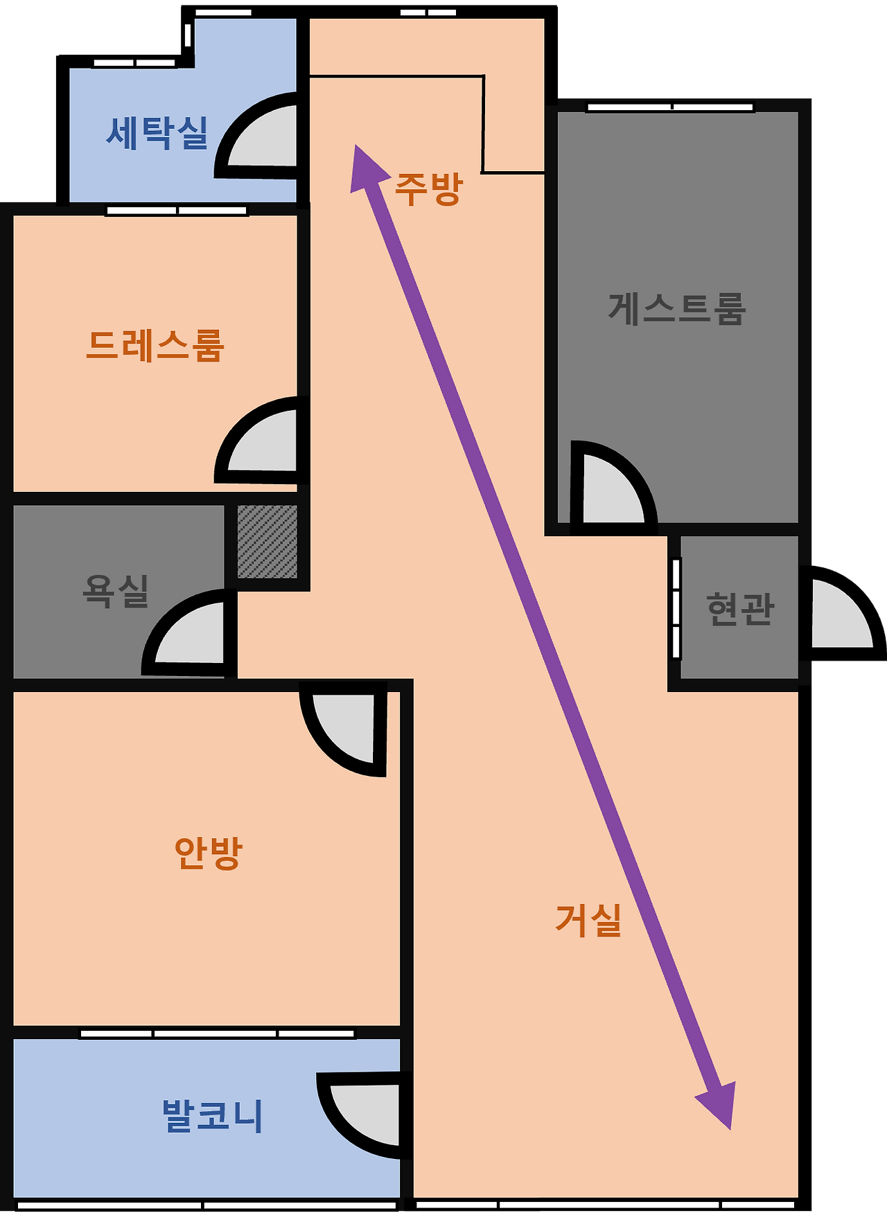 회색 공간은 금묘 구역이다 거실 발코니를 확장한 구조에 방이 셋 있는 아파트 평면도다. 현관엔 3연동 중문이 돼있어서 그대로 활용하기로 했다. 소음 감소와 단열, 공간 분리 등 사람이 취할 이점 외에 현관문이 열린 틈에 고양이가 튀어나가는 것을 막아주는 필수 장치다. 호기심과 영역 확장 욕구를 차단하기 위해 중문 밖 현관 공간은 금묘 구역이 됐다. 현관에 붙은 방 또한 금묘 구역이다. 게스트룸이라 이름 붙였지만 평상시엔 창고처럼 자주 드나들지 않을 공간이다. 냉난방을 자주 할 방이 아니라 주로 닫아둘 것이라는 게 첫 번째 이유고 고양이 알레르기가 있는 손님이 왔을 때에 대비하는 게 두 번째 이유다. 주로 닫아둘 공간은 애당초 영역으로 인식시키지 않는 게 낫고 지인 중에 고양이 알레르기가 있는 사람이 생각보다 많았다. 나와 반려인의 형제들 모두, 그리고 제법 자주 놀러 올 법한 친한 친구가 해당됐다.