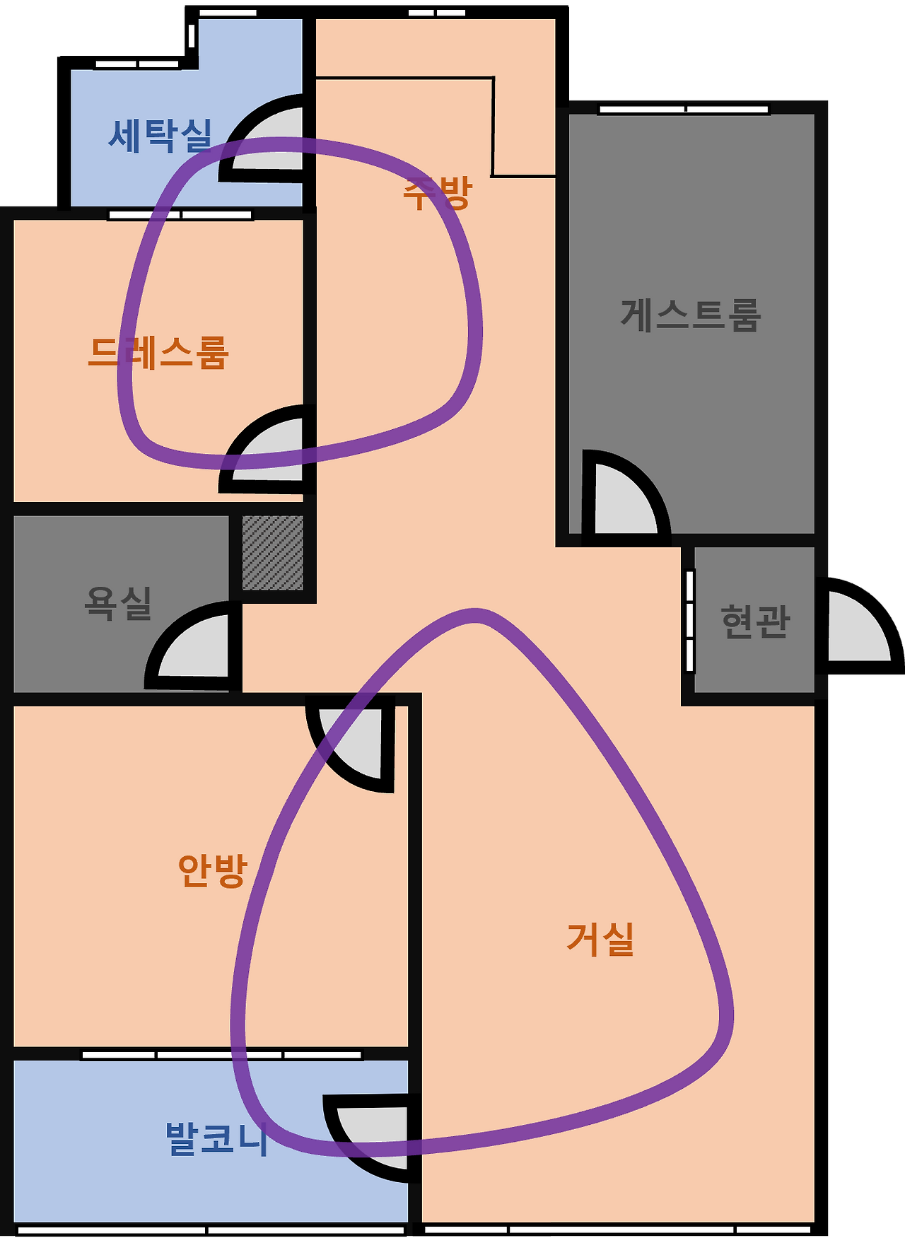 위의 두 사진을 보면 알 수 있듯이 방문이 유일한 출입로인 경우 직선형의 동선이 된다. 동선이 단조로울 뿐 아니라 고양이가 문으로 드나드는 반려인 혹은 다른 반려동물과 마주치면 퇴로가 확보되지 않아 불안감을 느낄 수 있다. 안방과 발코니, 드레스룸과 세탁실은 창문을 통해 퇴로가 확보된다. 게스트룸처럼 막다른 공간의 경우엔 수직공간을 구성하고 오르내릴 곳을 여러 군데 만들면 도움이 된다. 하지만 공간을 드나들 방법은 구조적으로 하나밖에 없다. 고양이 화장실을 발코니 끝 같이 막다른 곳에 두지 않는 이유도 마찬가지다.