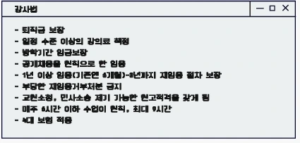 ‘강사법’은 정식 명칭이 아니다. 엄밀히 말하면 개정된 고등교육법 중 일부를 따서 ‘강사법’이란 명칭을 붙인 것이고, 여기서 명명하는 강사는 ‘시간강사’를 의미한다. 생계를 유지할 다른 일터를 가진 ‘겸임, 초빙 강사’는 법의 적용 대상이 아니다.