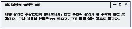 학교 밖에서 배움을 찾는 것은 실습강의가 전혀 ‘실습’이 아니기 때문이다. 1학년 때 수강한 전공 실습 강의는 실습강의에 대한 기대를 무참히 짓밟았다. 학습자가 수업 후 직접 응용할 수 있도록 교수가 직접 보여주고, 이론수업의 부족한 부분을 보충하기 위해 만든 것이 실습강의가 아닌가. 디지털 풍화가 잔뜩 진행된 강의 자료와 실습에 크게 도움이 되지 않은 PPT를 한 학기 내내 보며 지냈다.
