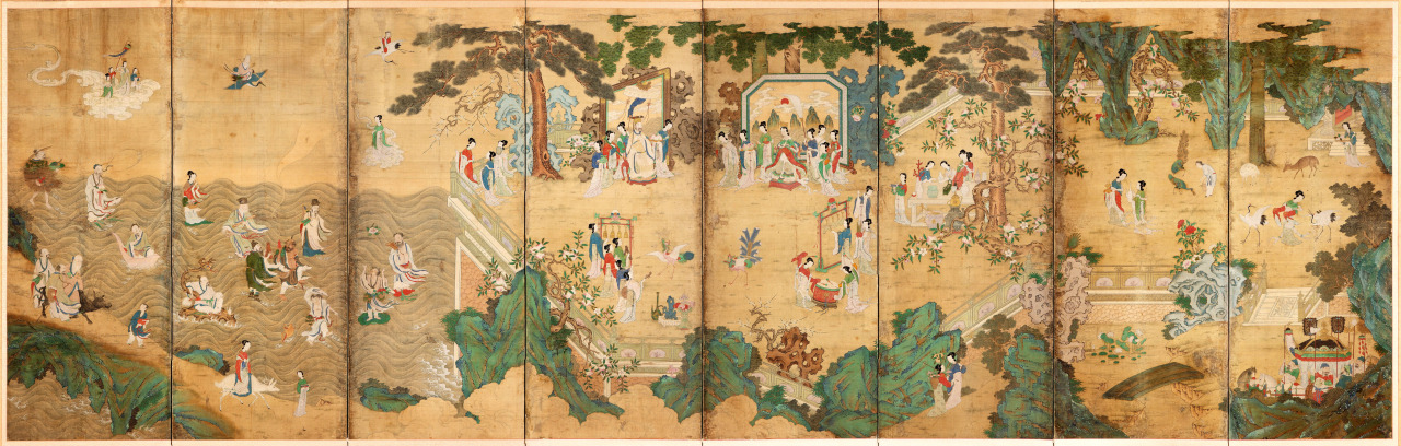 조선 후기 궁중을 중심으로 유행했던 요지연도는 중국 고대 전설 속 서왕모가 곤륜산의 연못인 요지(瑤池)에 주나라 5대 왕인 목왕을 초대해 연회를 베푸는 장면을 그린 그림이다.]