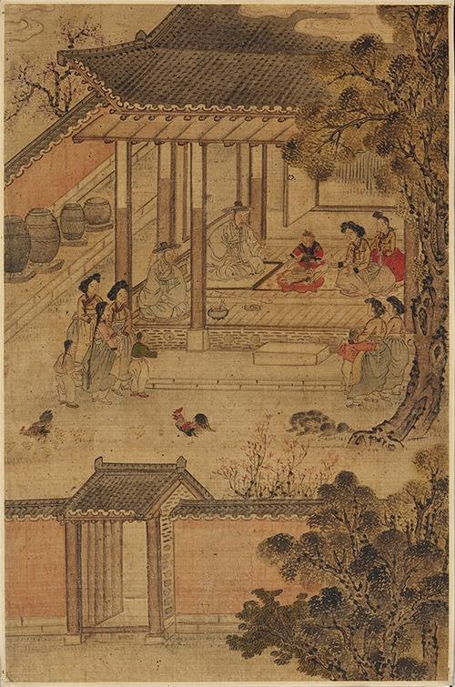 늙은이와 젊은이, 여성과 남성, 아이와 어른이 모두 등장하는데, 이들이 입고 있는 옷은 한복의 전형을 보여준다. 중산층 집안이고 계절은 봄으로 4월쯤으로 추정된다.]