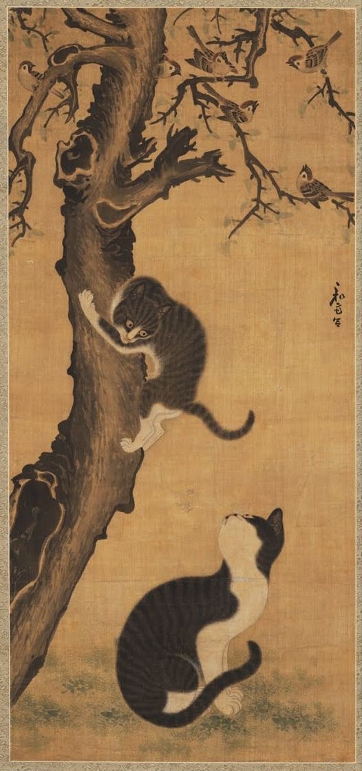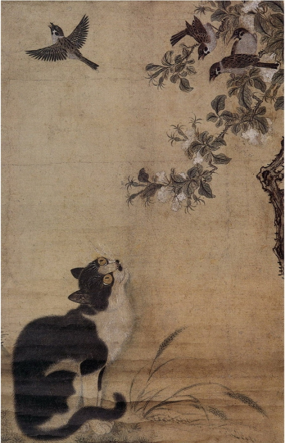 [변상벽/묘작도/비단에 채색/34.9*54.6/일본 동경박물관 소장. 묘작도는 고양이와 참새를 그린 것이다. 고양이가 참새를 잡아먹기 위해 노려보는 것이 아니다. 고양이는 웃고 있는 표정이다. 참새는 내면의 즐거움을 뜻하는데 이와 호응하기 위한 설정과 표현이다. 고양이는 장수와 효를 뜻하는데, 효의 실천은 삶의 진정한 즐거움이라는 철학적 내용을 담고 있다.]