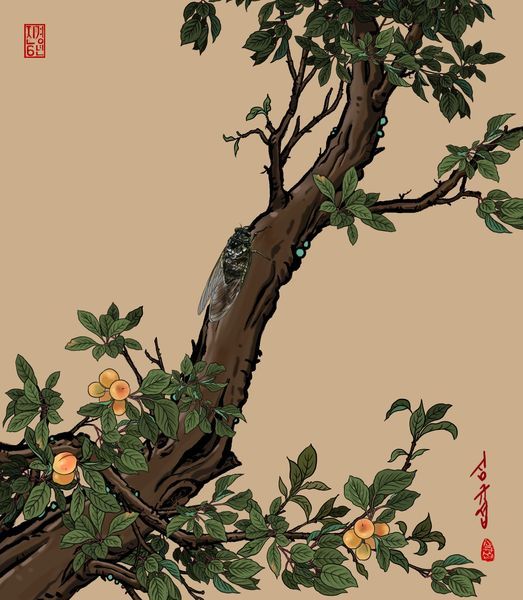 살구나무에 붙어 있는 매미를 그렸다. 한여름 살구가 열릴 때면 매미는 극성스럽게 울어낸다. 살구, 복숭아, 자두는 같은 시기에 나는 여름 과일이다.