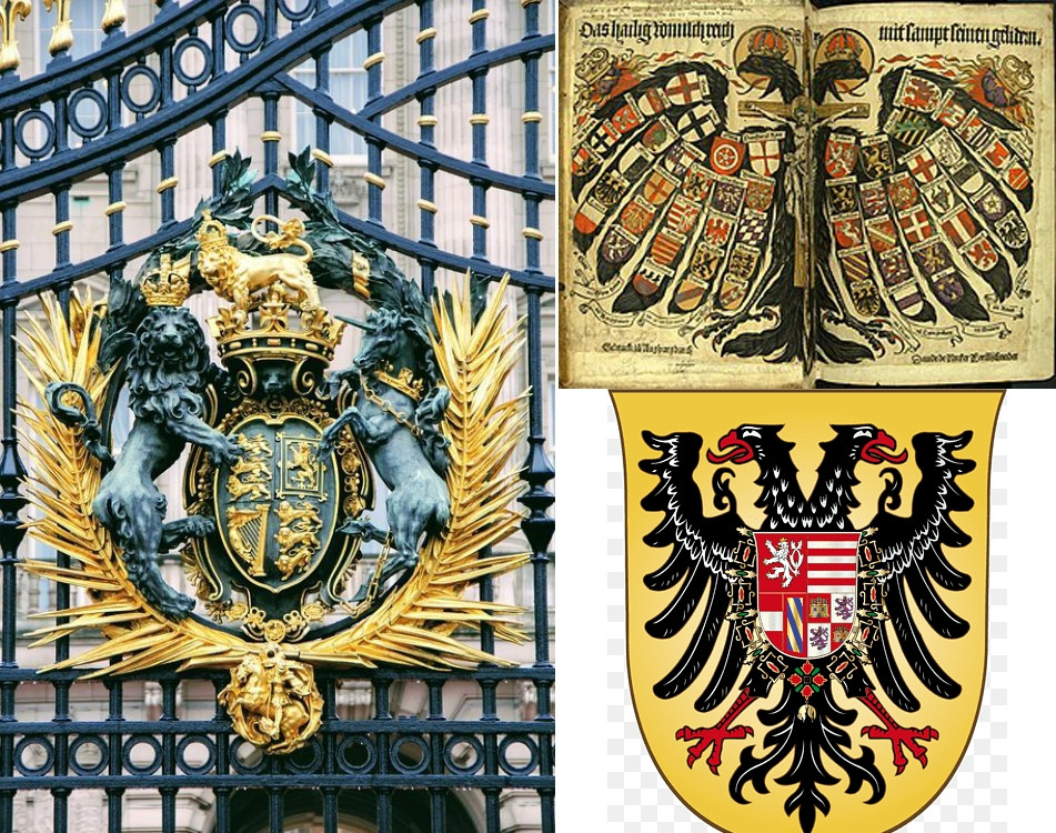 [유럽왕실문장과 로마제국의 문장이다. 대부분 괴수, 무기, 금은보화로 장식한다.]