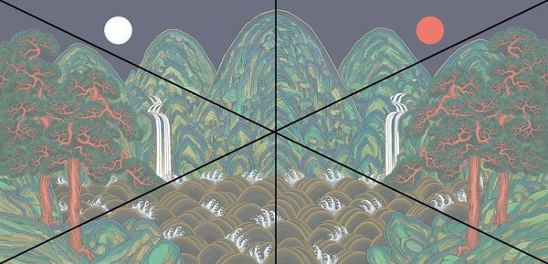 [오봉도는 우리전통그림에서 유일한 좌우대칭형 그림이다. 좌우대칭형은 도상을 간결하게 만들고 왕을 부각시킨다. 완벽한 대칭은 아니며 약간의 변화를 주었다. 우측의 붉은 해를 복사해 좌측에 그렸다. 다섯 개의 봉우리는 특별한 의미가 없다. 우리그림은 숫자를 이용한 상징을 사용하지 않는다.]