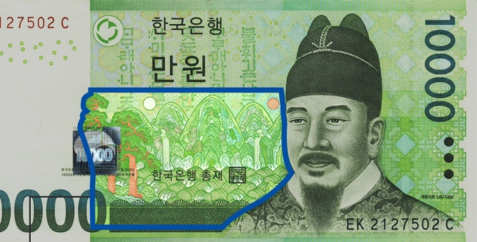 [만 원 권 지폐에 오봉도가 새겨져 있다.]