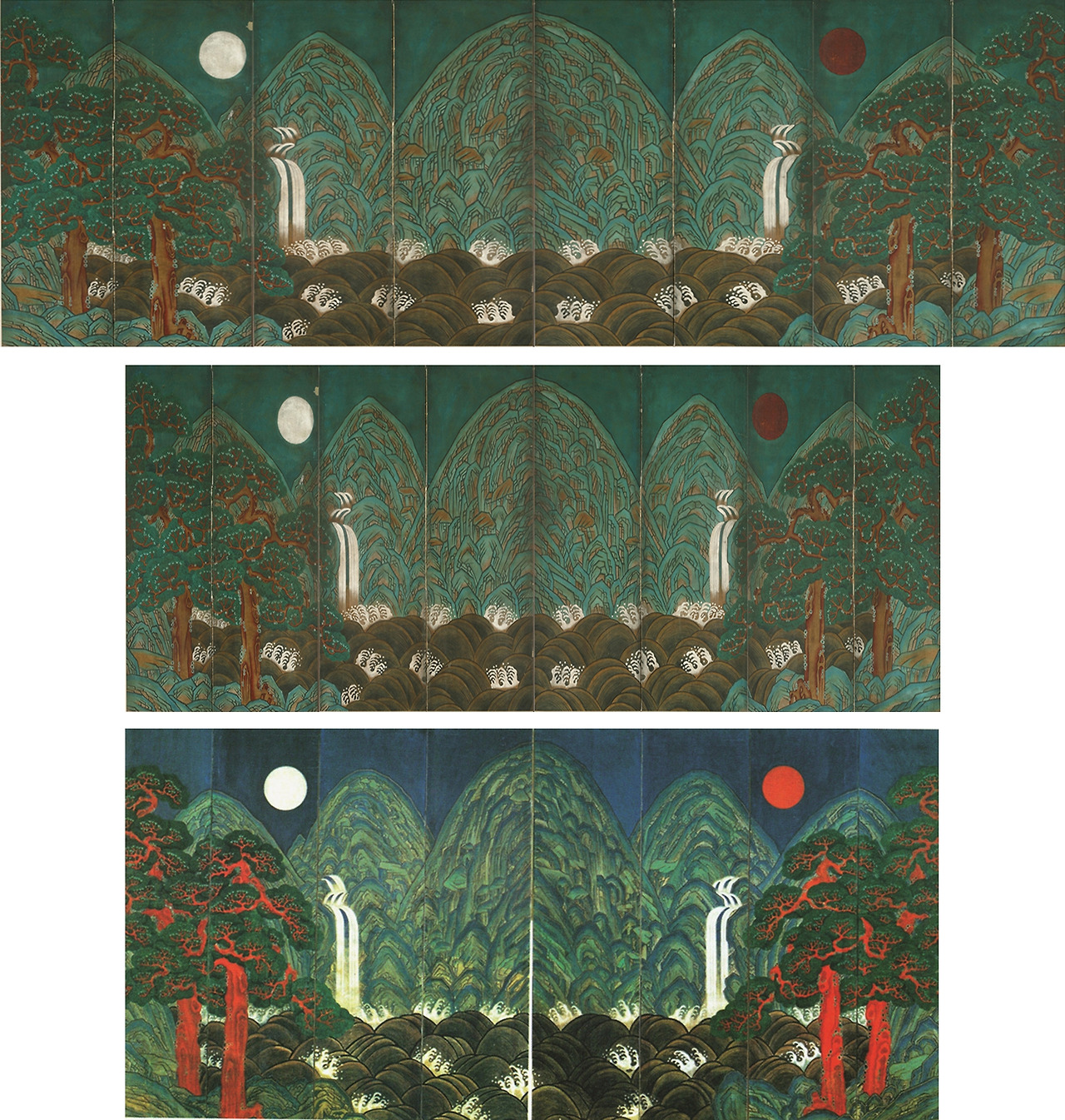 [소성박물관 오봉도는 의도적으로 가로 2폭을 늘였다. 이를 다시 줄이면 아래 오봉도와 비슷해진다. 이를 통해 두 오봉도가 같은 초본을 사용했다는 것을 알 수 있다.]