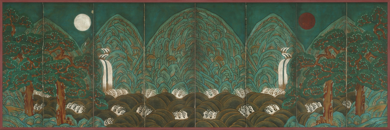 이 작품은 이미 있던 8폭 그림을 옆으로 늘여 2폭을 더 만들었습니다. 이 때문에 높이 솟은 봉우리는 완만해지고, 길쭉하던 소나무는 짧고 통통해진 것입니다.”