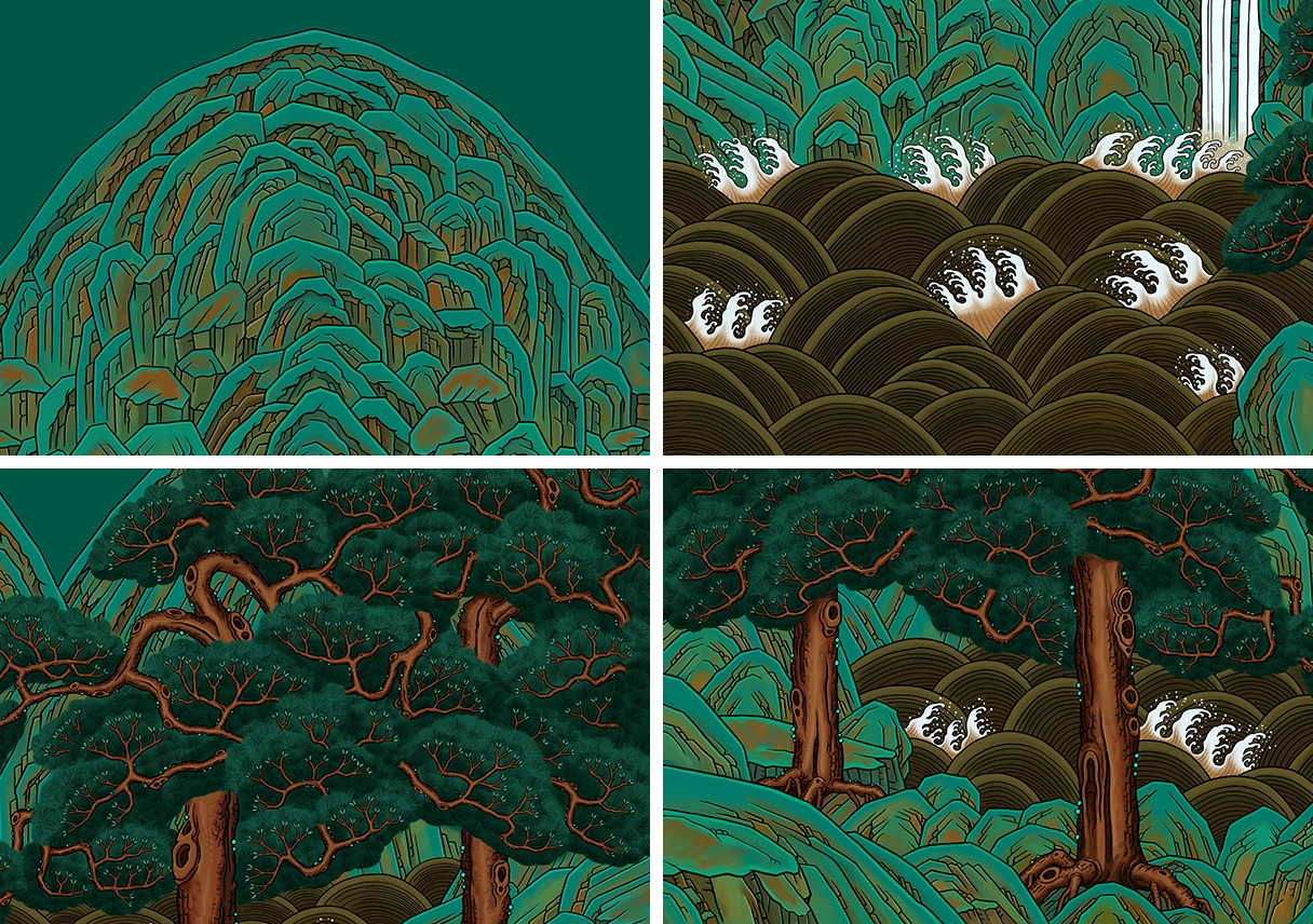 배경의 봉우리보다 진하게 표현하면 확실한 효과가 나타나지요. 봉우리와 거리감을 나타내기에도 좋습니다. 이를 위해 선묘 위에 채색을 하고 다시 덧칠하는 방법을 사용했습니다.”