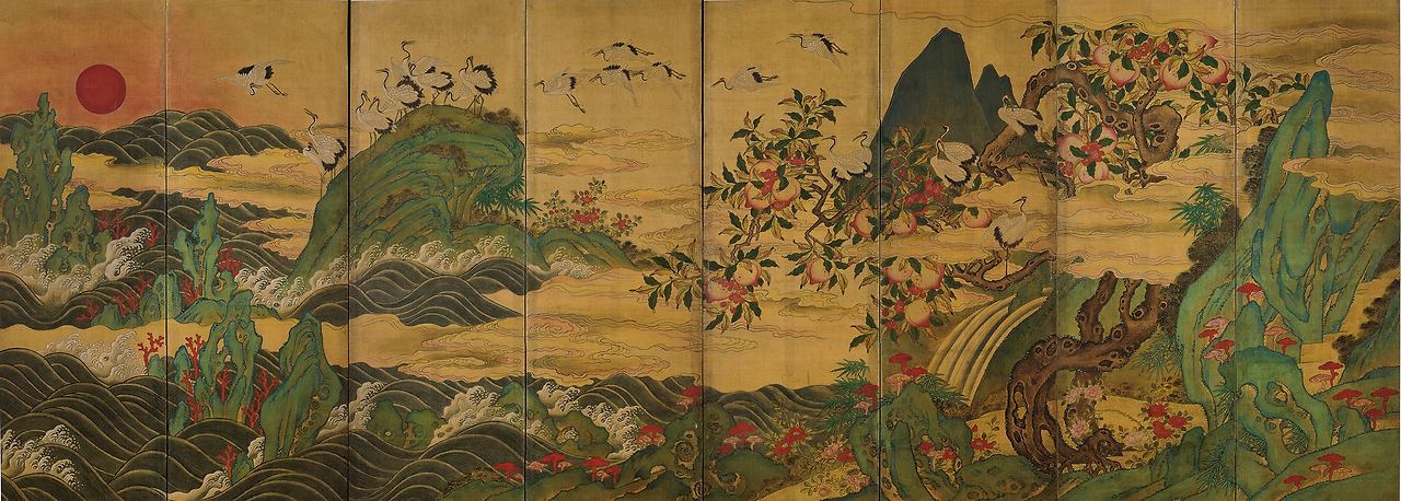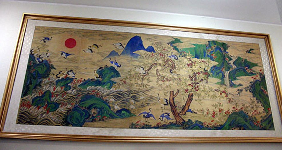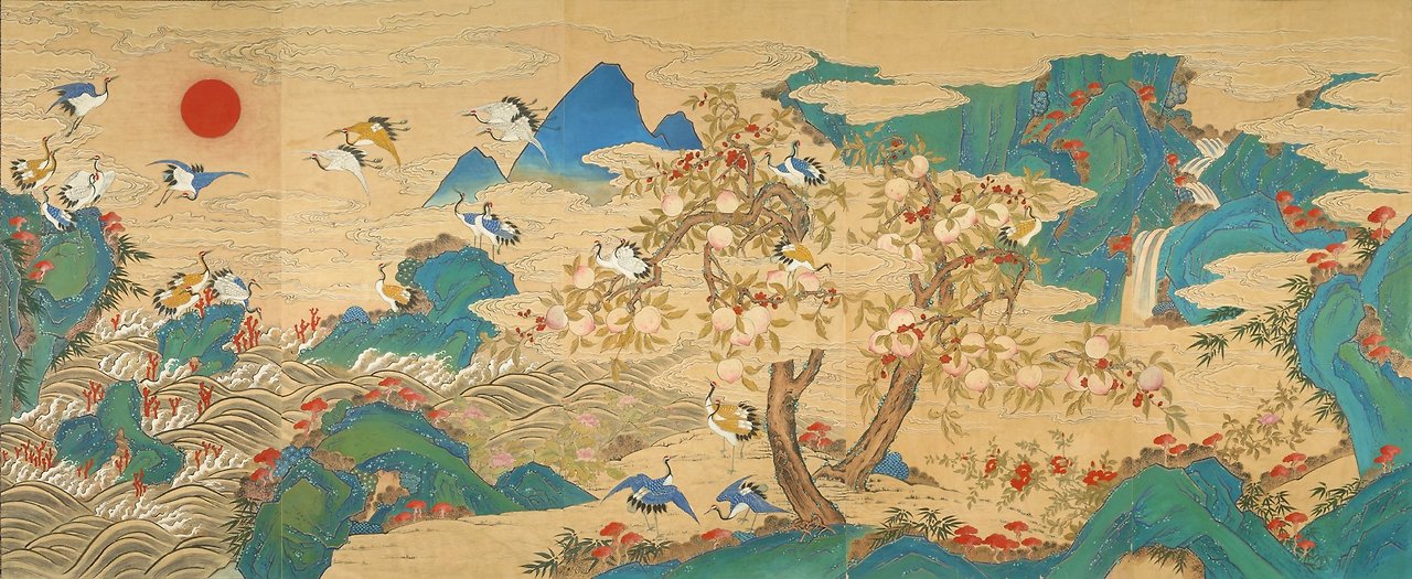 [해학반도도(海鶴蟠桃圖)]는 바다(호수)와 두루미, 신령한 복숭아를 소재로 한 전통 왕실그림이다.