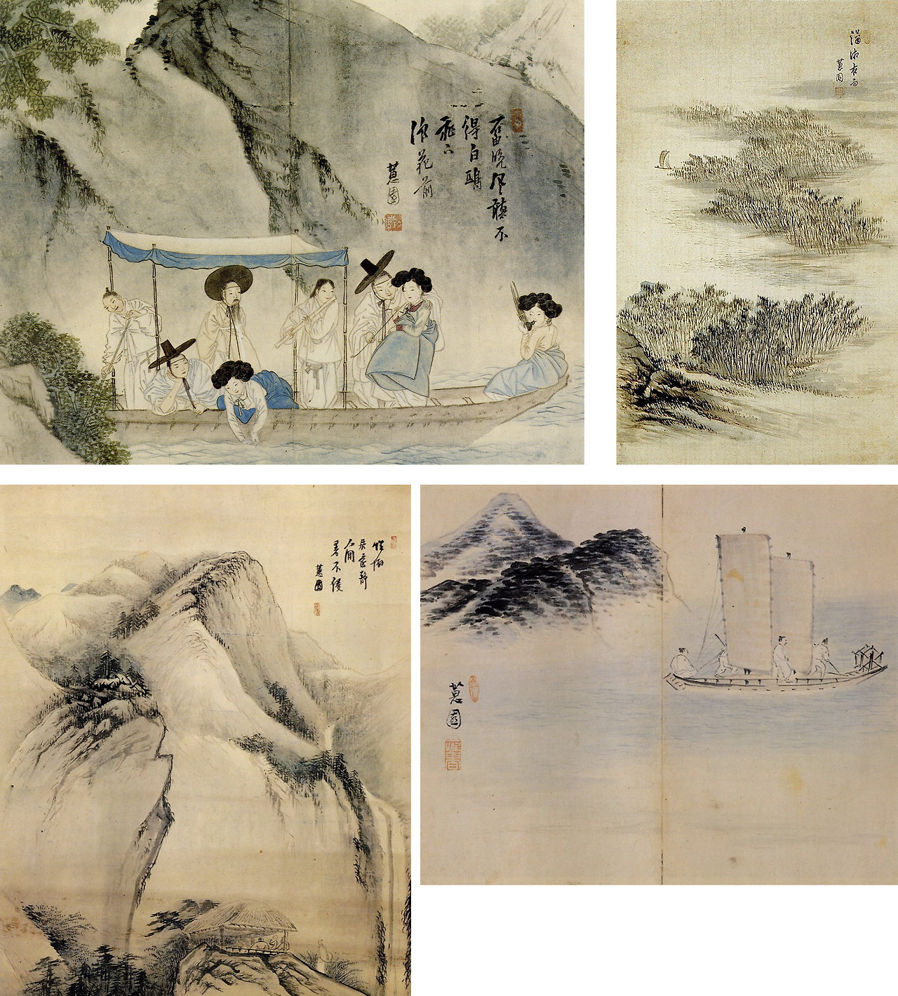 [신윤복은 먼 거리 명승지가 아니라 동네 유원지를 그렸다. 구름이나 안개를 이용한 여백을 둘 공간이 없을 정도로 시공간이 가깝다. 심지어는 인물과 산수화를 함께 그려 풍속화인지 산수화인지 구분이 되지 않는다.]