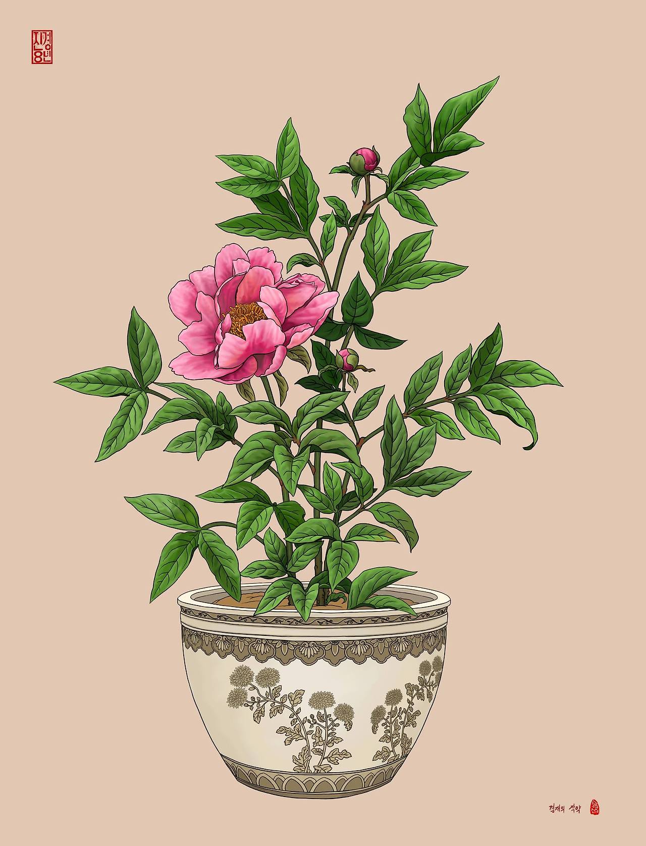 [겸재의 작약/심규섭/디지털그림/2023. 독서여가 작품을 바탕으로 작약꽃을 그렸다. 물받침대를 빼고 꽃은 크게 그렸다. 겸재 선생은 작약꽃을 보면서 무슨 생각을 했을까? 그 마음을 따라가고자 했다.]