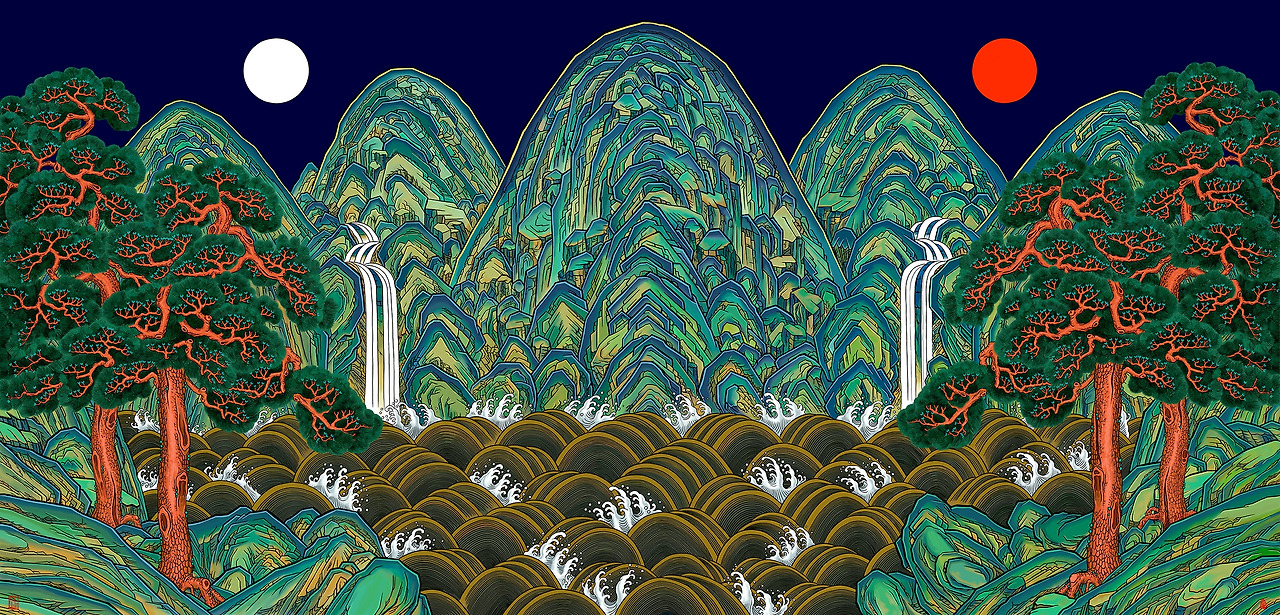 [심규섭/오봉도/디지털그림. 가장 전형적인 오봉도이다. 진한 청록색으로 봉우리와 바위를 칠했고, 하늘은 석청과 검정과 섞어 그렸다. ]