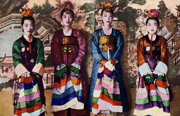 [조선 말기의 기생 모습이다. 이 당시 기생은 천민이 아니라 평민 신분이었다. 배경의 곽분양행락도로 보이는 병풍은 높은 관직이나 큰 부잣집 잔치를 의미한다. 공연하고 난후 기념으로 찍은 것이다.]
