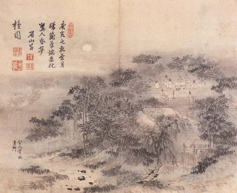 [인왕산 자락 아래에서 시회(詩會)를 하는 여항인의 밤 모임을 묘사한 단원 김홍도의 ‘송석원시사야연도(松石園詩社夜宴圖)’(1791). 정조 임금 때인 1791년 천수경의 집 송석원에서 열린 시모임이다. -시회(詩會)는 풍류의 정점이다.]
