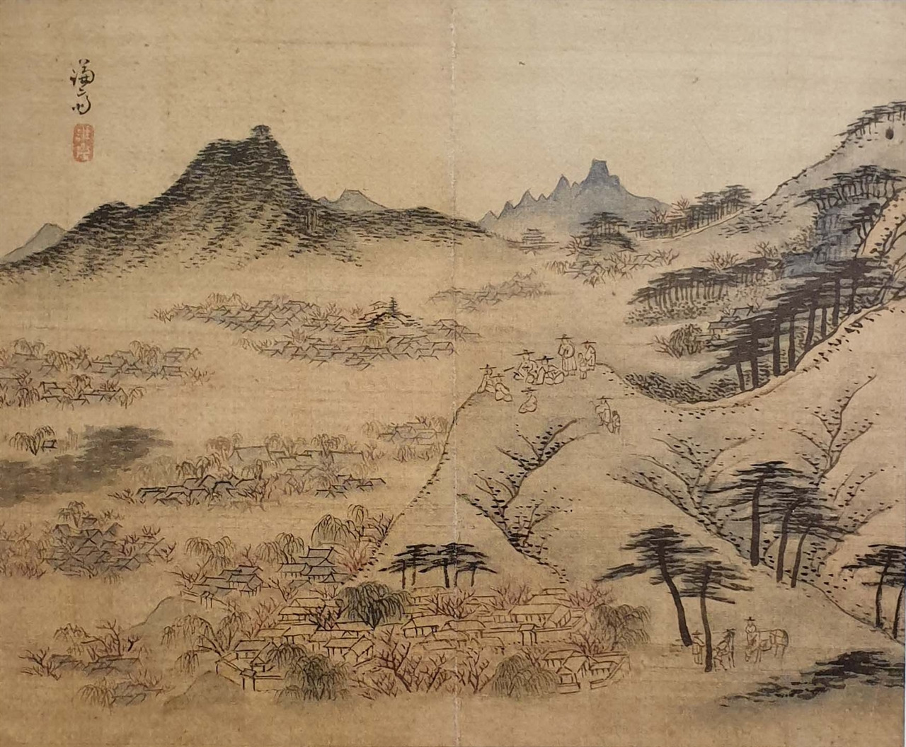 [정선/필운대상춘/25.6x31.8cm/종이에 수묵/개인소장 -한양 필운대에서 복사꽃 놀이를 하는 장면이다. 필운대 아래 풍경은 한양 모습이다. 집집마다 복사꽃이 피었다. 당시 한양은 복사꽃 천지였다.]
