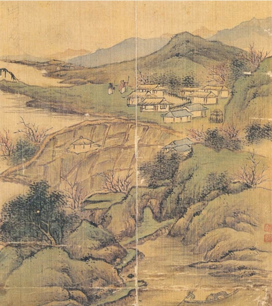 [이하곤(1677~1724)/도원문진도/비단에 채색/28.5*25.8/18세기 초/간송미술관 소장. 조선 후기 문인 화가였던 이하곤의 작품이다. 무릉도원 이야기를 진경산수화 풍으로 그렸다. 작품의 제목은 잘못되었다. 길을 묻는 것이 아니라 전체를 다 그려놓았다. 그냥 무릉도원도가 적절하다.]