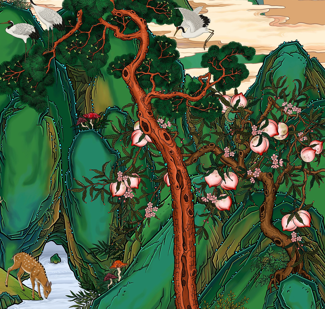 [십장생도/심규섭/디지털 그림. 십장생도는 생명력이 풍부한 태평성대를 뜻한다. 조선이 민본정치를 통해 구현하고자 하는 최종적이고 완전한 이상세계를 표현한 것이다. 십장생도를 장생하는 그림이라고 여기는 것은 백성들의 현실적 욕망인 풍요와 건강 장수를 반영한 것이다.]