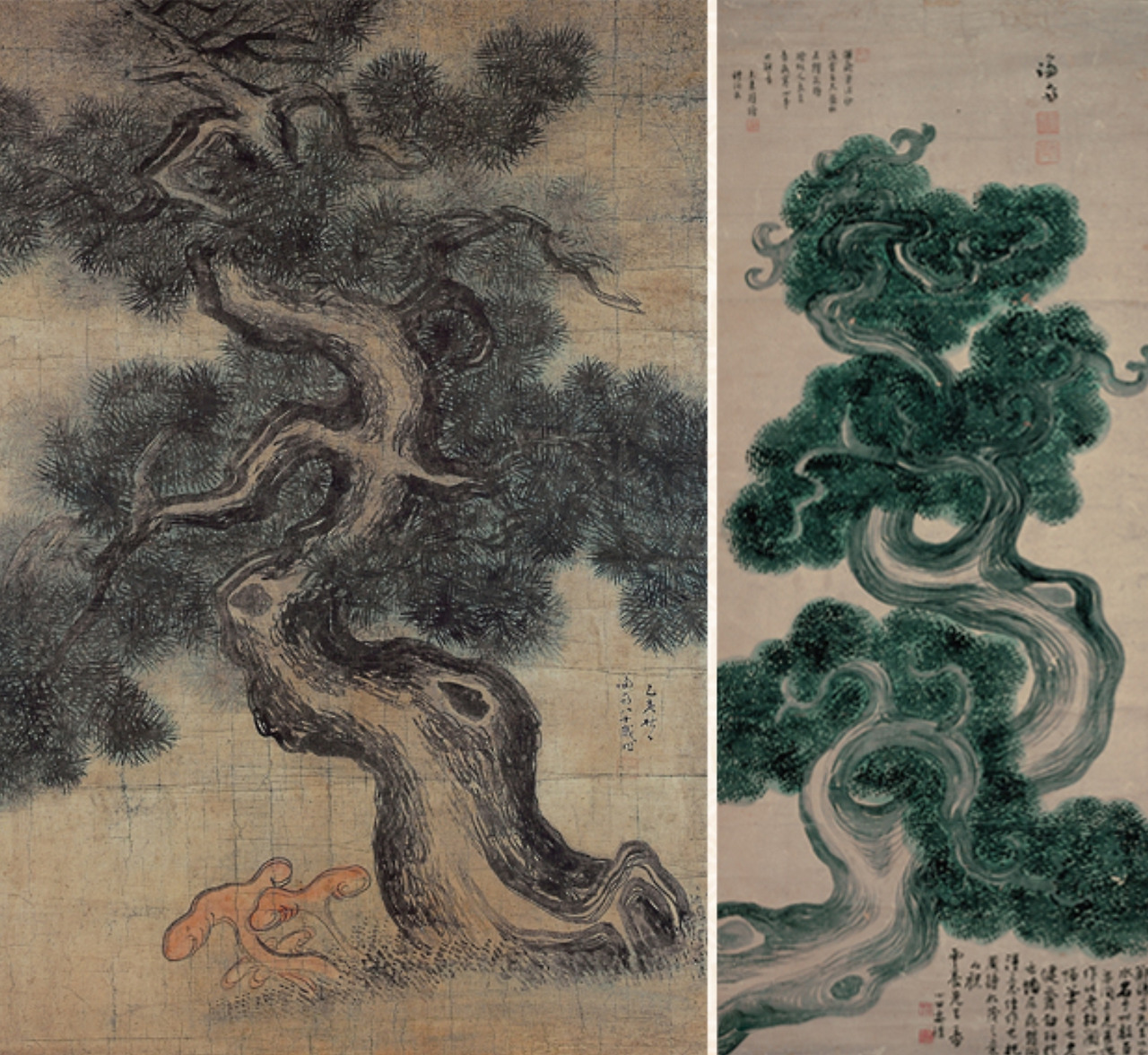 [겸재 정선/노송영지도/비단에 담채/1755. 소나무를 마치 목숨 수(壽) 모양으로 그렸다. 겸재는 선비 화가로 성리학과 주역에 능통했기에, 수(壽)를 사회적 존재인 사람으로 이해하고 있었다. 사철나무인 소나무의 ‘항상 푸름’과 사회적 존재인 사람을 결합하여 양심을 가진 군자의 모습을 표현한 것이다. 이 작품에서 영지는 불로초가 아니라 군자의 향기를 뜻한다.]