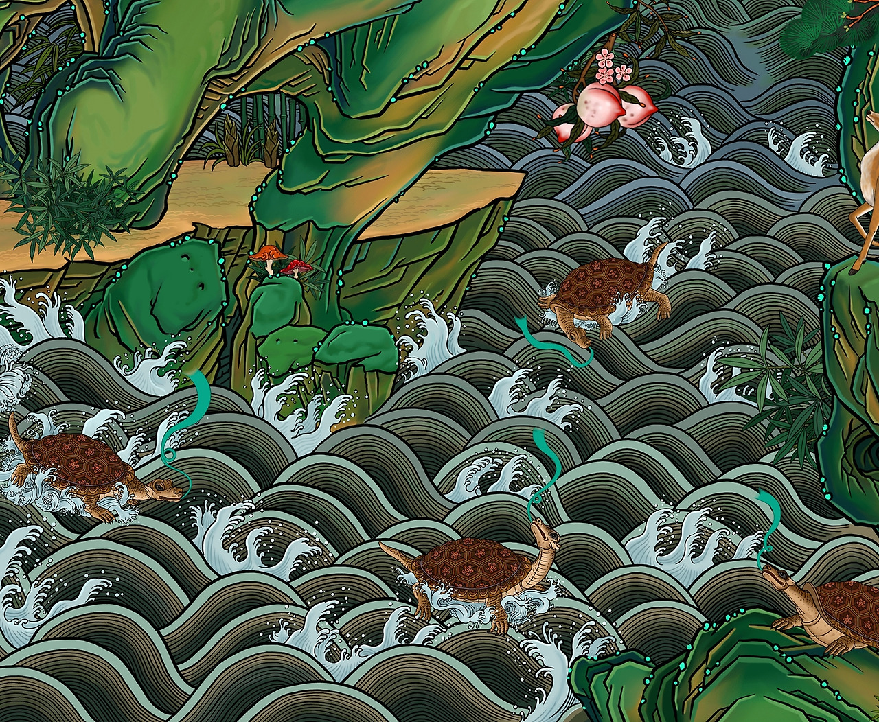 [학과 사슴, 복숭아를 더 많이 그렸고 화면 전체에 태점을 넣었다.]
