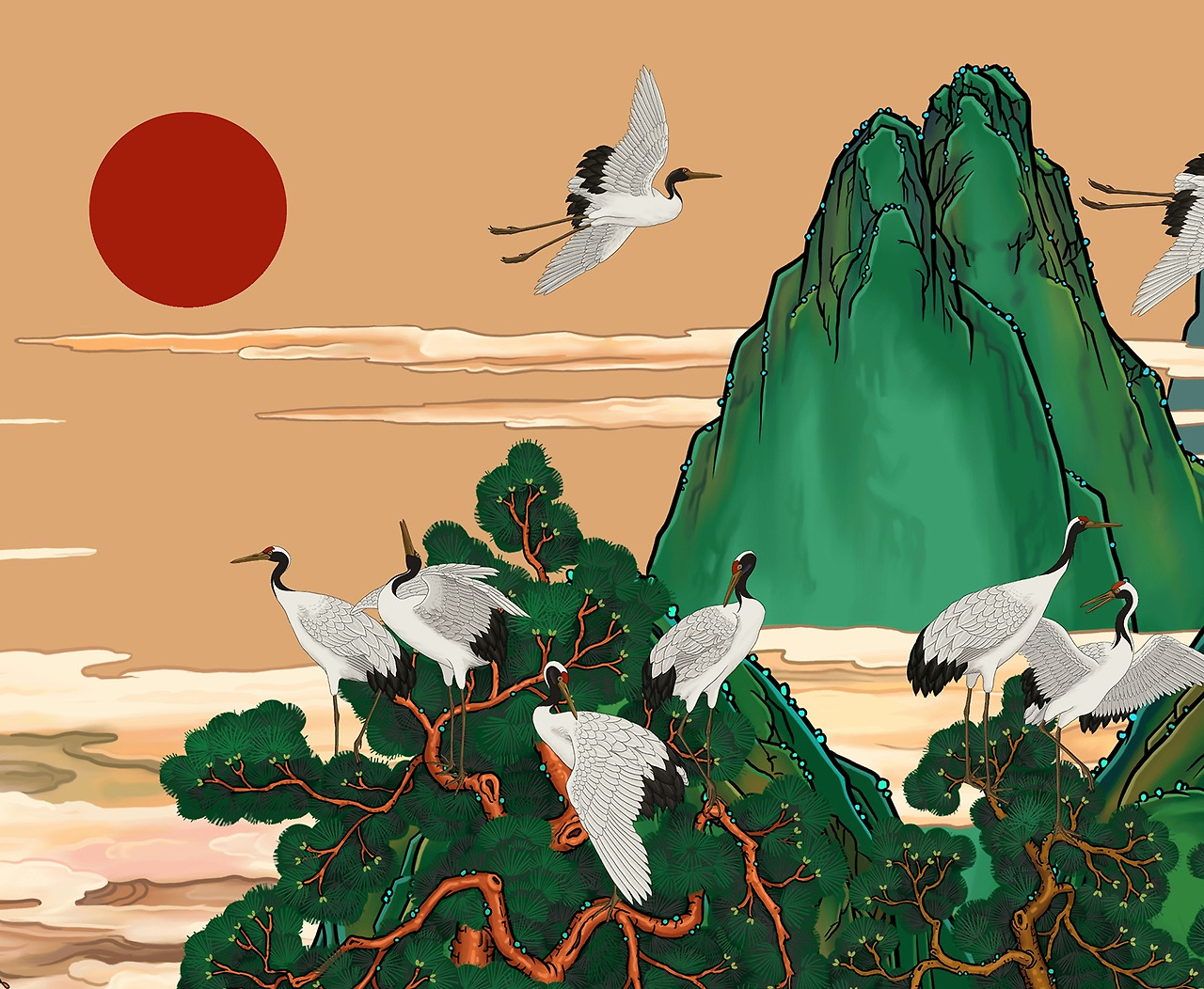 십장생도에서 붉은 해는 영원함을 의미하지요. 아침 해를 중천에 그린 것은 태평성대가 절정이라는 의미를 포함하기 위함입니다.”