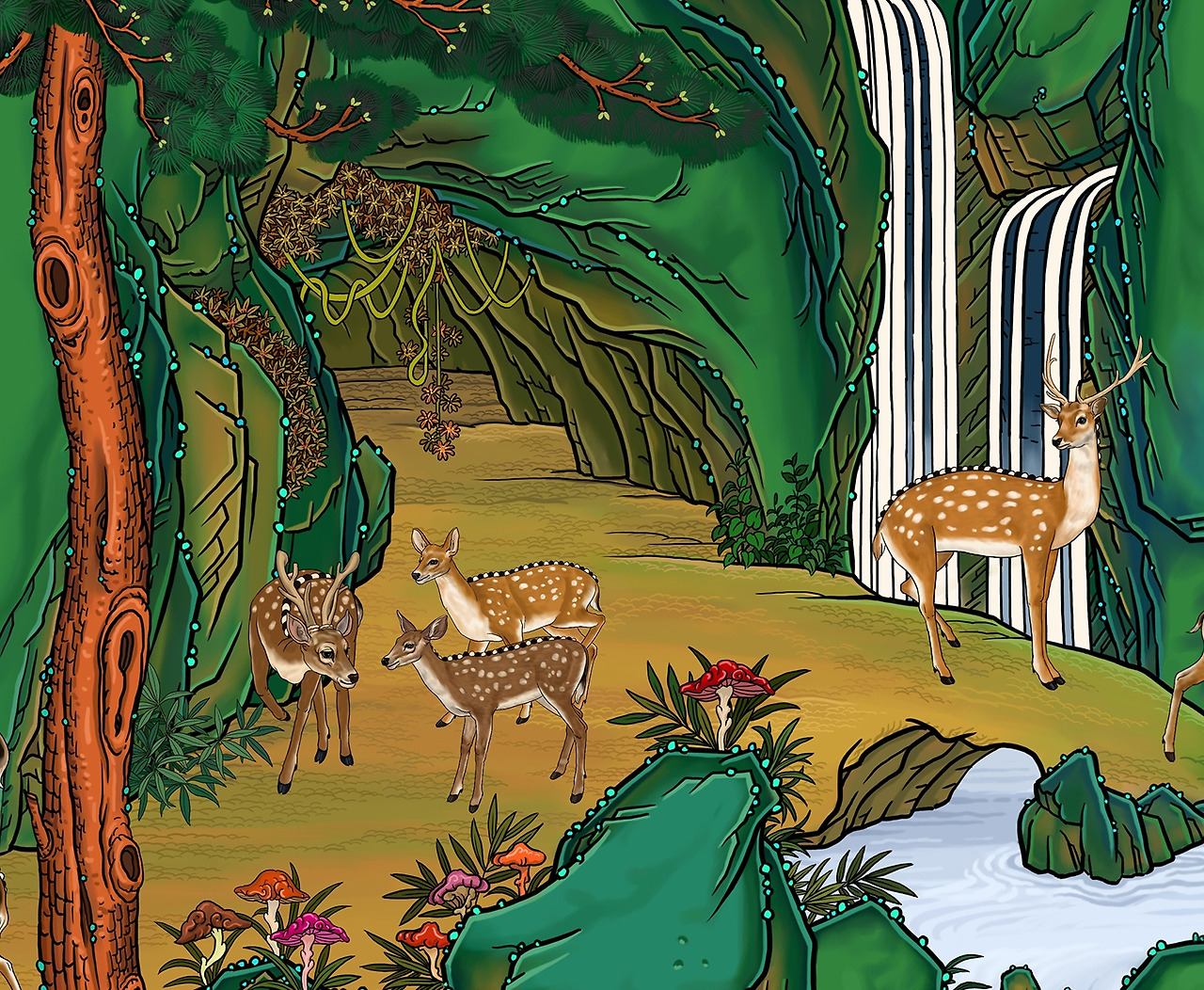 폭포는 두 군데 그렸고, 영지를 먹던 사슴 대신 물을 먹은 모습으로 바뀌었네요. 좀 더 현실감이 있습니다.