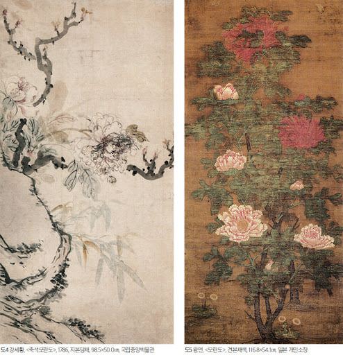 [궁중모란도는 강세황의 수묵모란도나 중국 모란도와는 전혀 다른 도상과 형태를 가지고 있다.]