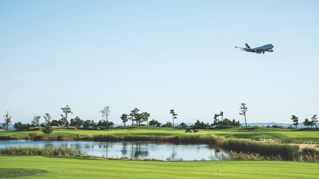 바닷가에 있는 골프장이지만 수려한 해안선이나 푸른 물결이 넘실대는 낭만적인 바다가 보이는 것도 아닙니다. 대양의 수평선을 끌어안는 풍경도 아니지요. 바다는 뻘 빛을 머금은 짙은 은회색 빛이고 그 바다를 가로지르는 인천대교 너머 송도 신도시가 보입니다. 바로 옆에는 인천국제공항 활주로가 있어 코앞에서 몇 분 간격으로 대형 여객기가 뜨고 내리며, 비행기 엔진 소리도 끊임없이 들립니다.
